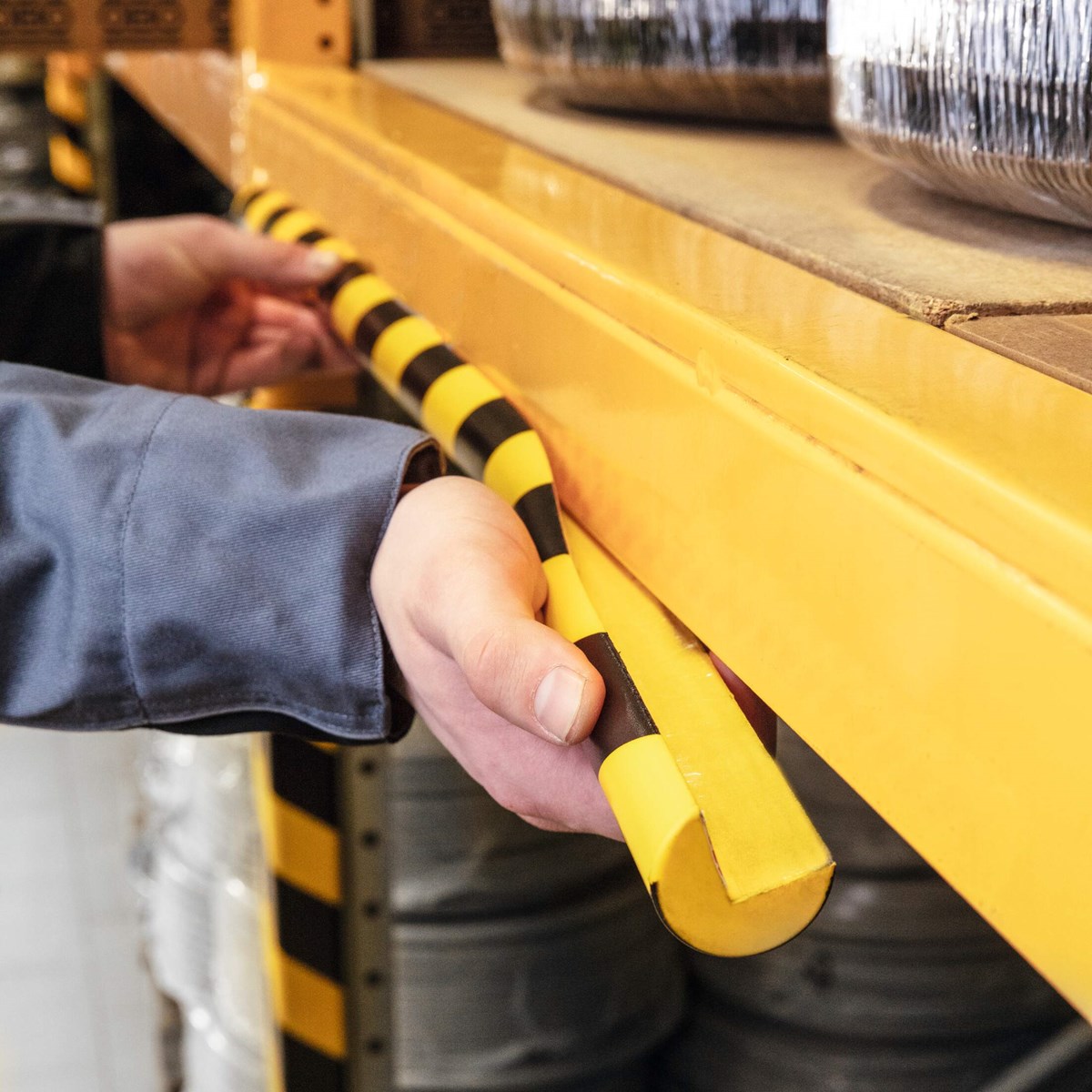 De svart/gula ränderna varnar för vassa hörnor och polyuretan skummet, som skyddsprofilen är tillverkad av, är stötdämpande. Det självhäftande hörnskyddet skärs till önskad längd med en vass kniv. stark, självhäftande klisteryta av god kvalitet som bl.a. fäster på metall, trä, kartong och kakel med bäst resultat om temperaturen är 10-30°C. Färgnyanser enligt ASR A1.3 liknande RAL 1004/9003 (signal gul/signalsvart).