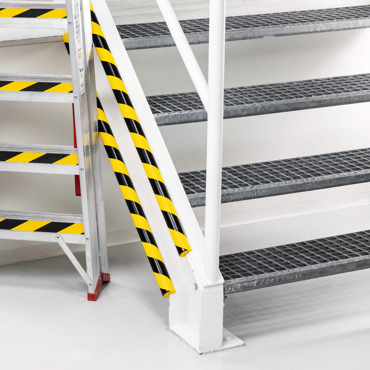 De svart/gula ränderna varnar utstickande balkar och kanter och polyuretan skummet, som skyddsprofilen är tillverkad av, är stötdämpande. Kantskyddet skärs till önskad längd med en vass kniv. Färgnyanser enligt ASR A1.3 liknande RAL 1004/9003 (signal gul/signalsvart).