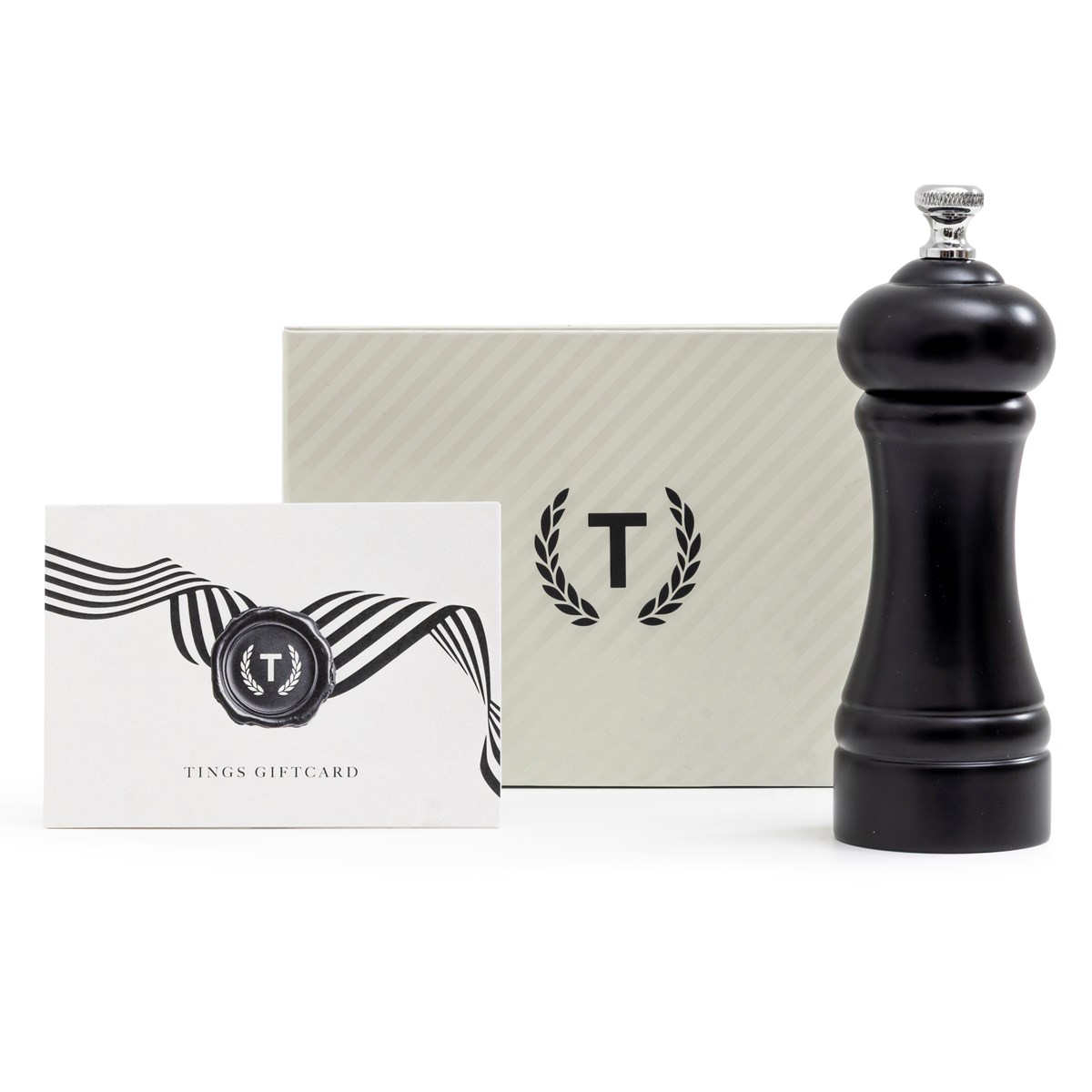 Tings Giftcard med en pepparkvarn som premie/extragåva. Kvarnen är 14 cm och försedd med keramiskt verk. Kvarnen kommer förpackad tillsammans med julkort och gåvokort i en elegant box.