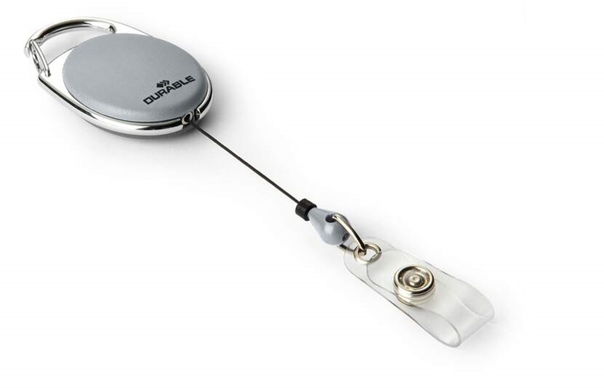 Stilren jojo nyckelhållare med knäppfäste för t ex namnskyltar, ID- och passerkorthållare eller nycklar. Utdragbar nylonlina upp till 80 cm. Med hake av metall som kan hakas fast i en byxhälla, på en väska eller i en nyckelring. I kombination med korthållare blir det smidig hantering vid dörrpassager.