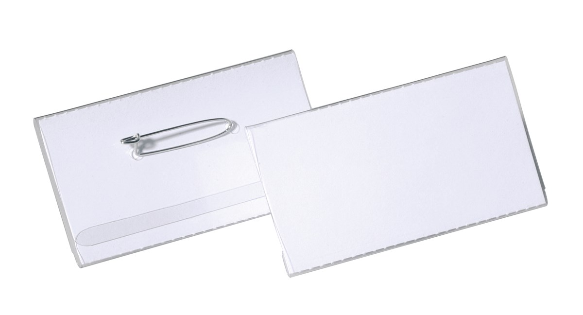 I glasklar hårdfolie (pvc) med nål, för fastsättning på alla sorters kläder. Neutral, utbytbar insticksetikett.
