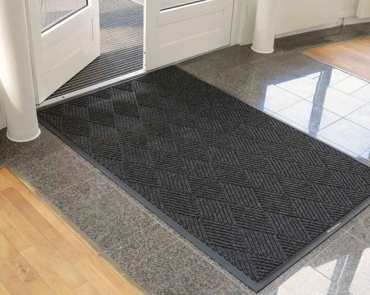 En extremt slitstark matta som skrapar av grov smuts och suger väta. Ytskiktet består nu till 100 % av återvunna PET-flaskor och baksidan är av SBR-gummi – dock är det samma goda kvalitet och utseende på mattan. Gjuten, fasad gummilist. Nabbad baksida ger god ventilation mot golvet. Mått: 89 x 150 cm. 9 mm tjock.