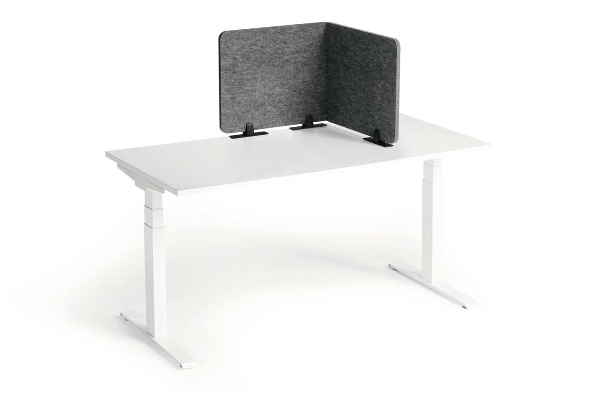 Vikbar bordsskärm av återvunnen PET-filt för effektiv avskärmning och ljuddämpning av arbetsplatsen. Väldigt flexibel skärm som kan anpassas individuellt tack vare steglöst justerbara vinklar. Bordsskärmen kan användas i hela sin längd eller vikas på 4x40 cm för längd 1,60 m eller 2x60 cm för längd 1,20 m. Ger en personlig avgränsning av arbetsplatsen och bättre akustik som minskar störande ljud. Flera olika möjligheter för montering gör att den kan anpassas efter behov. Passar för höj- och sänkbara bord: står stadigt och insynshöjden på 50 cm över bordsskivan bibehålls.
