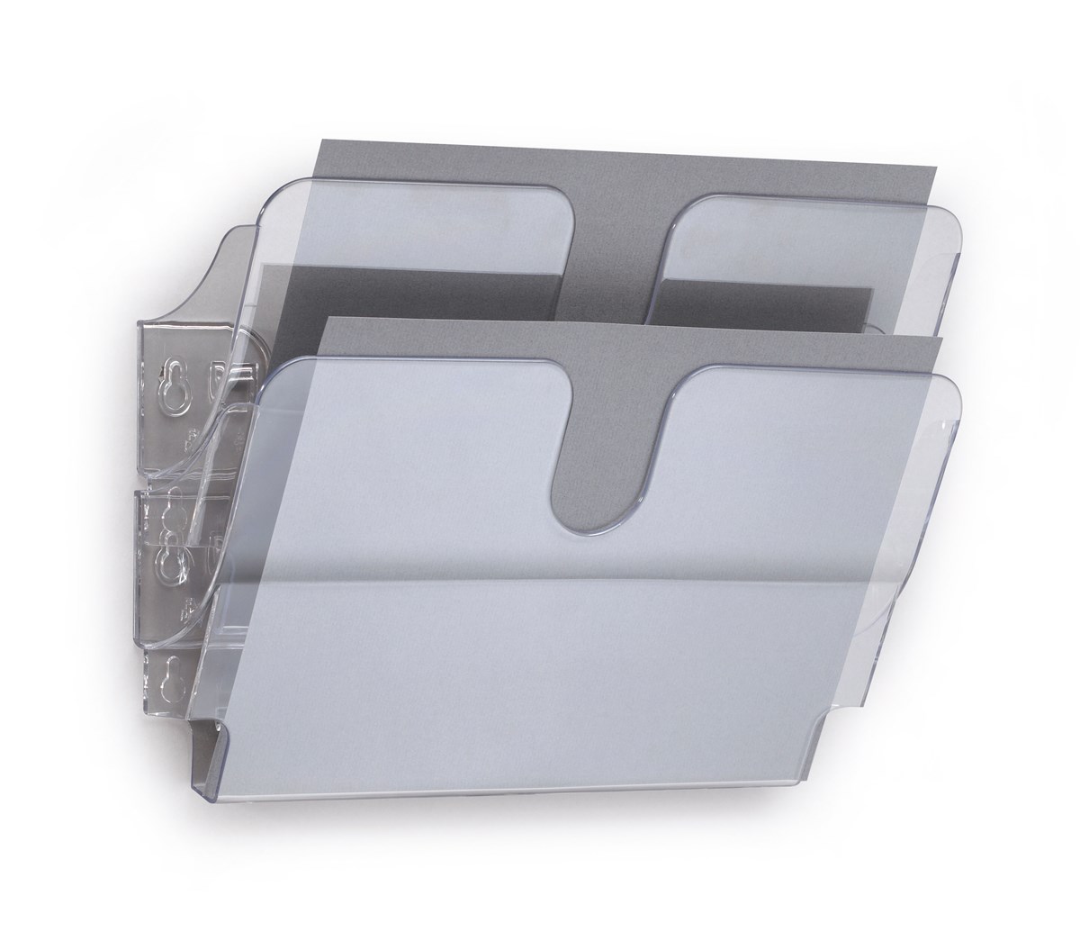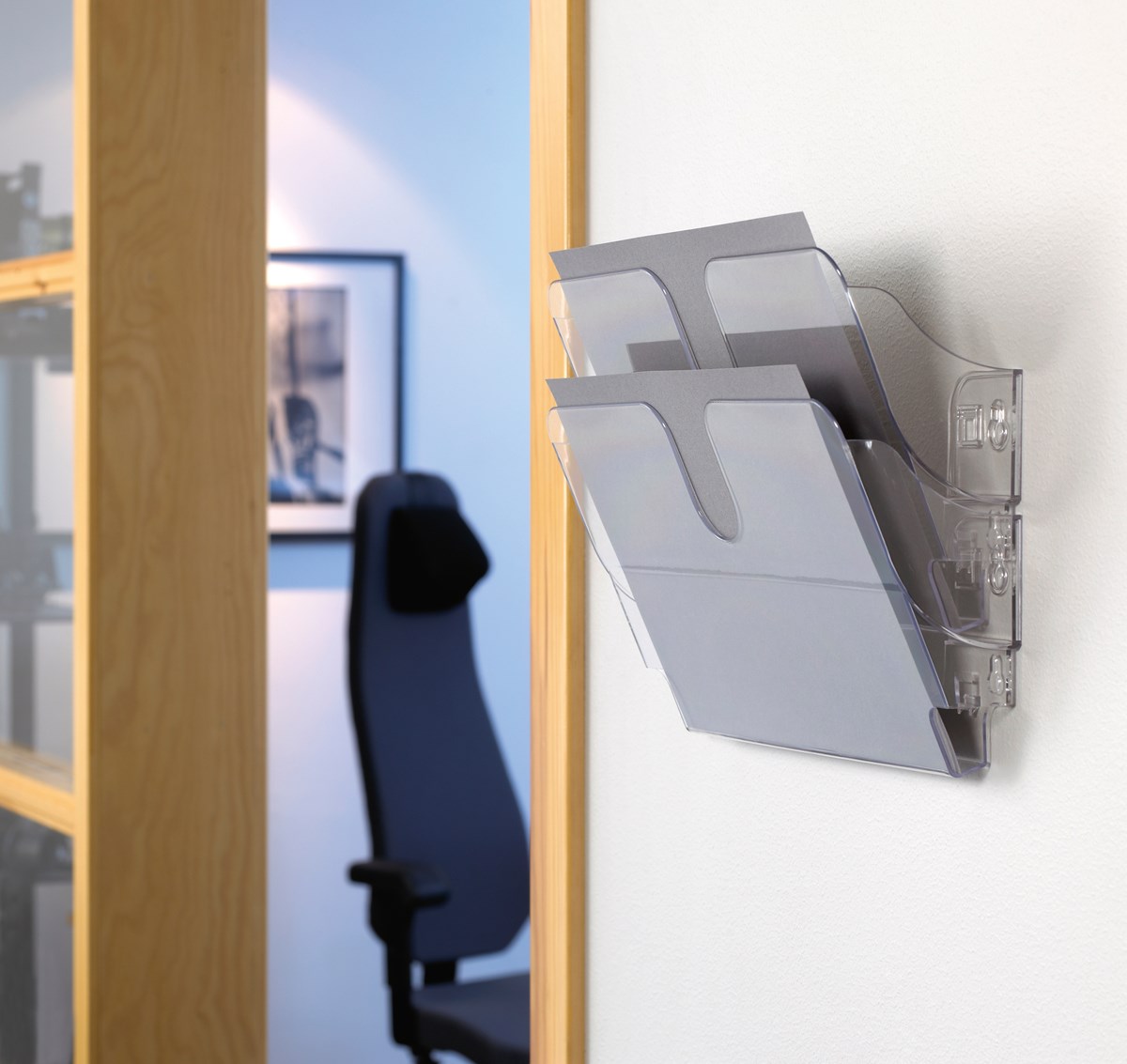 Blankettfack, broschyrställ, postfack - FLEXIPLUS är en serie med platsbesparande, flexibla och väggmonterade hållare för broschyrer, tidskrifter, blanketter och annan information i A4-format. Varje fack har en kapacitet på 24 mm tjocka buntar. Detta är ett komplett set med 2 fack i liggande format där facken kan monteras ihop eller användas var för sig. Ett set med skruv och plugg ingår. Varje facks mått är 34x19,5x3,5 cm (BxHxD). Monterat vinklat ut från väggen bygger den 10 cm och har en bredd på 34 cm och är 25 cm hög när båda facken är ihopsatta. Går att bygga på med fler fack efter behov genom att haka i facken efter varandra.