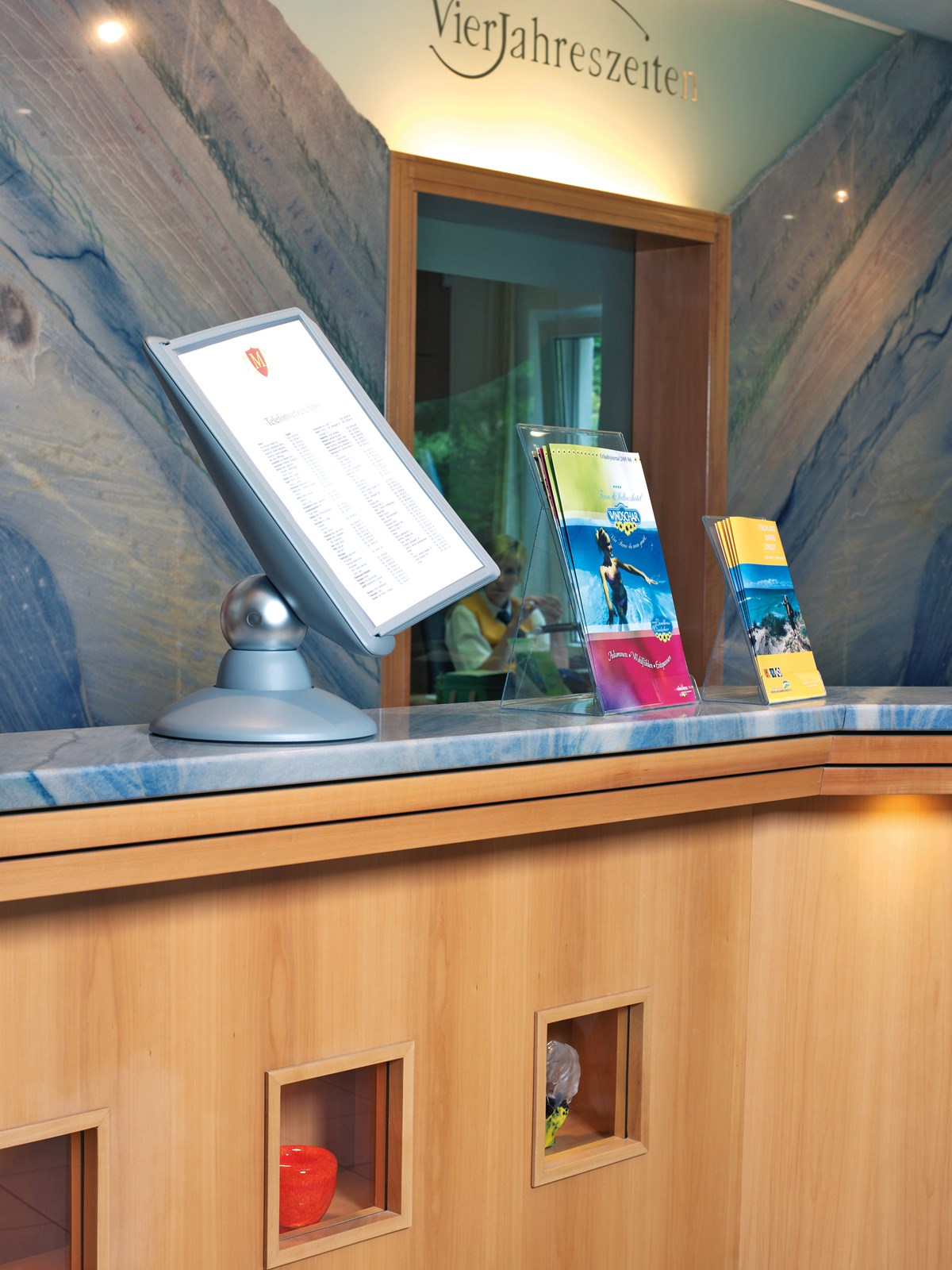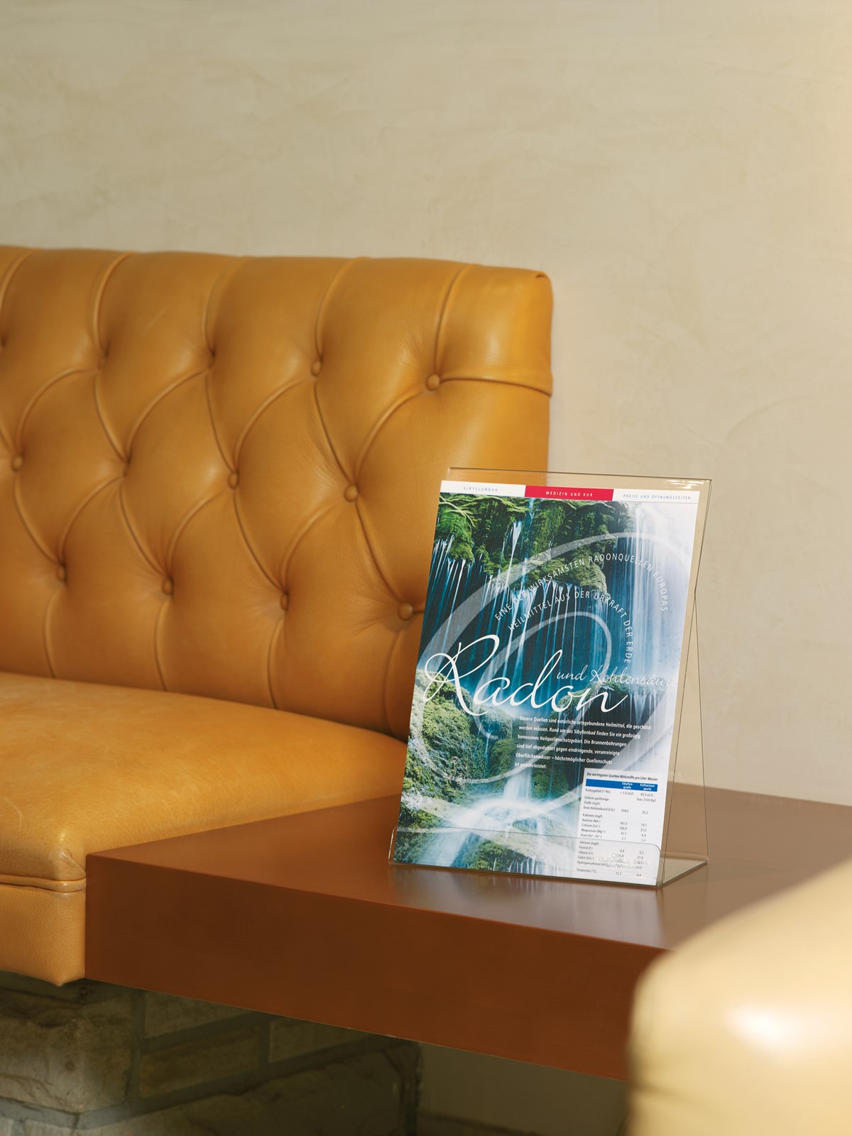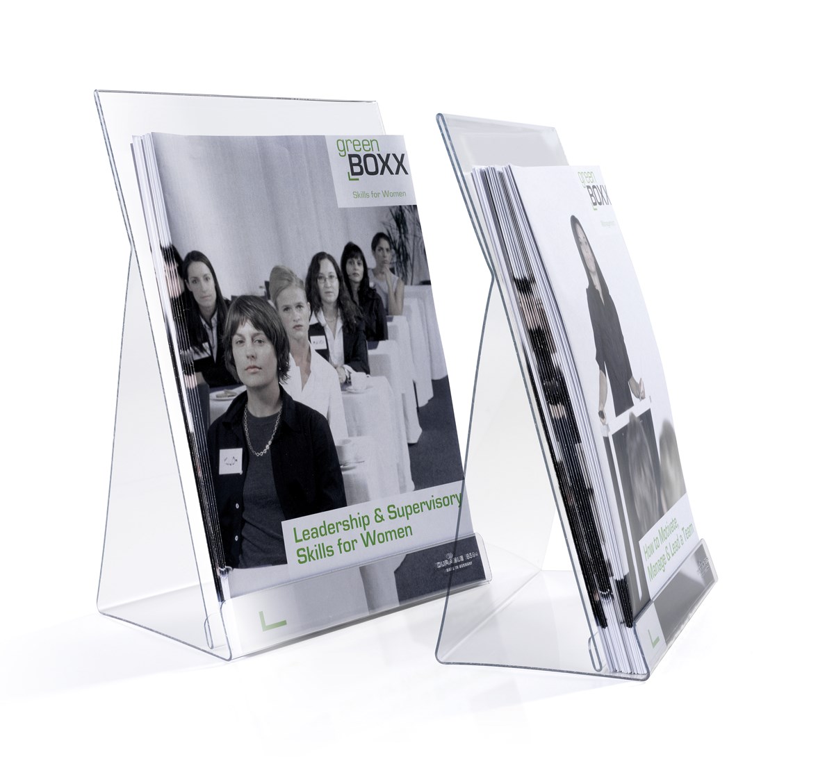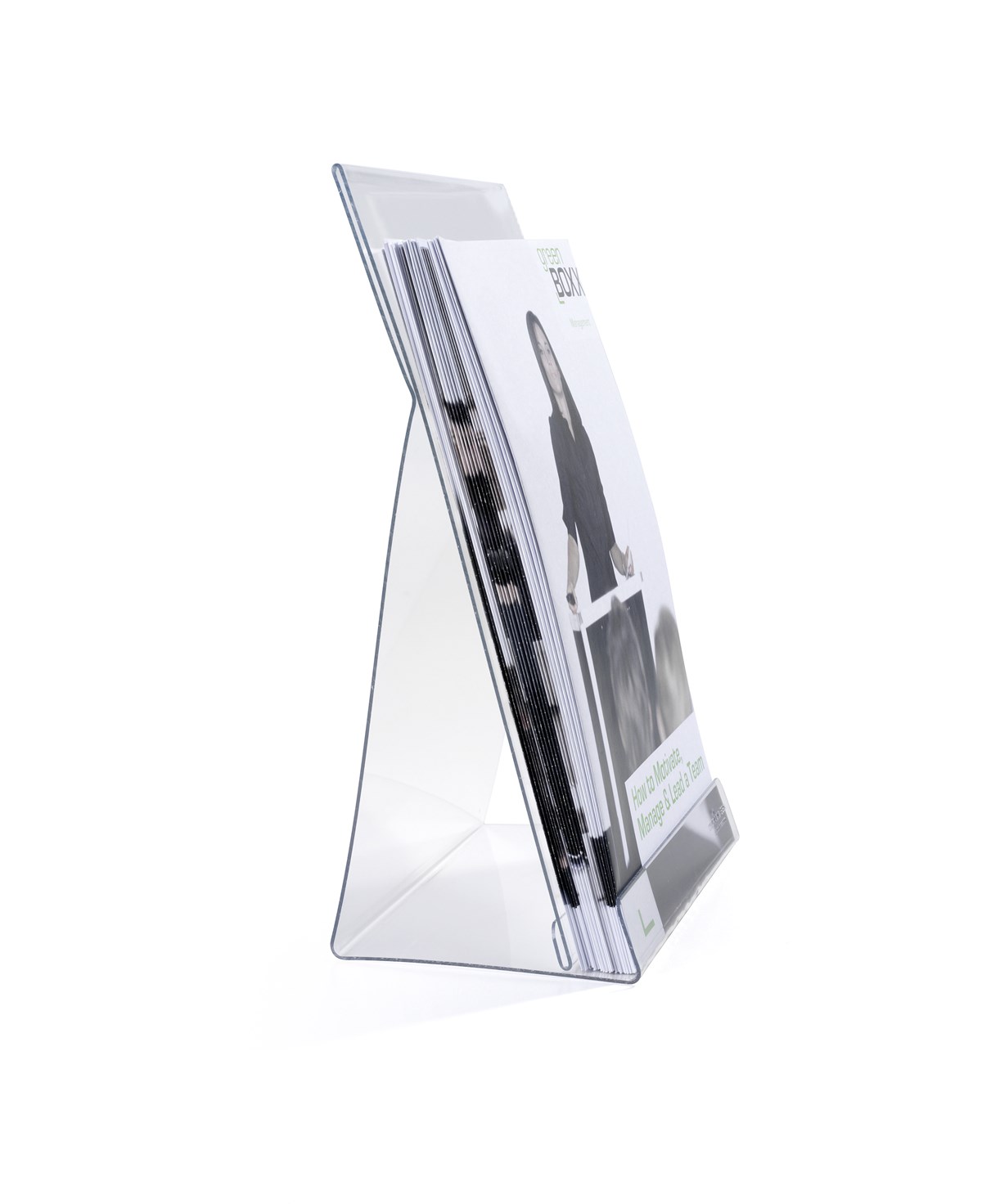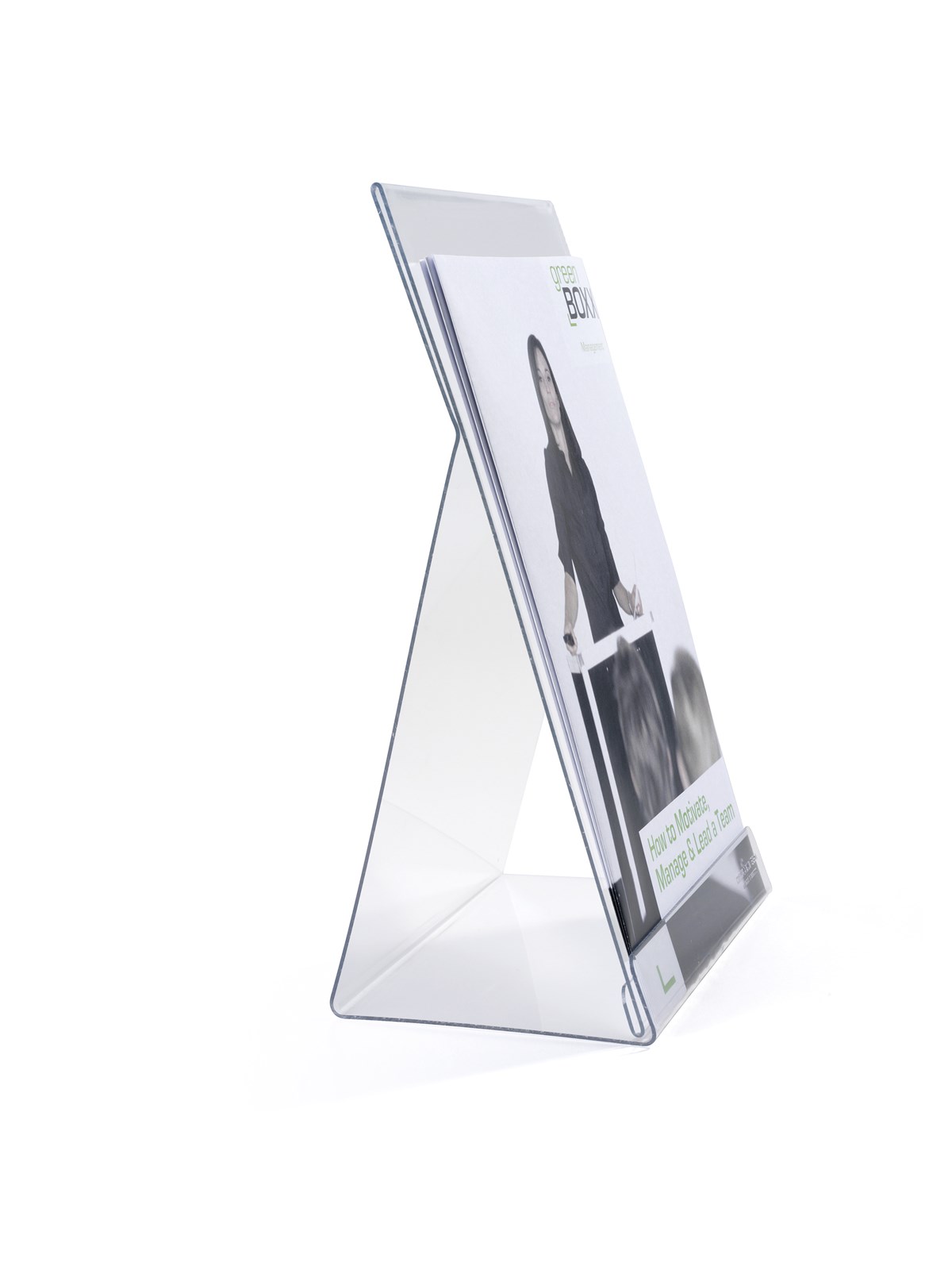 Broschyrställ av transparent polystyrenplast för receptioner, utställningslokaler, mässor m.m. Materialet kläms fast på framsidan, titelsidan kan skjutas in bakom för att ange vilken broschyr som ska finnas i stället.