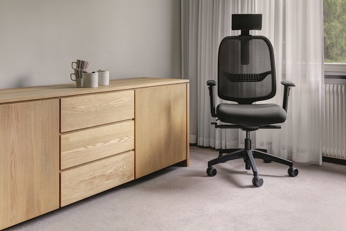 Rygg klädd i nät som dels ger ett behagligt stöd men också bra ventilation för ryggen. Inställbar synkrongunga som ger maximalt stöd genom att följa kroppens naturliga rörelser och ger maximalt stöd av svank, ländrygg och bröstrygg. Sits med sitsdjupjustering. Rygg: 46 x 54 cm. Sits b x d: 54 x 48 cm. Sitthöjd: 42–52 cm. Hjul för hårda golv. Tyg: svart Event. Armstöd och nackstöd är tillval och köps separat.