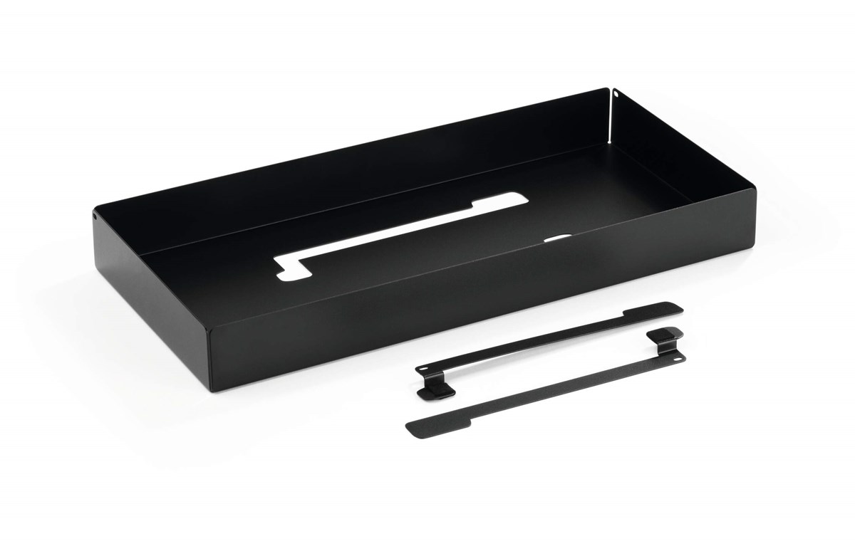 EFFECT-serien som denna låda ingår i, tillverkas av metall och har en mjuk, ljuddämpande och tålig bottenmatta av filt. Filten är tillverkad av PET-plast, varav 60% är av insamlad och återvunnen PET-plast (rPET). Material från lådans botten har använts till två glidskenor, som fästs i skärmstället. Hålen efter dessa skenor täcks av filtmattan. Produkterna i serien är 100 % återvinningsbara och förpackas hållbart med resursbesparande och plastfria material. Maxbelastning 5 kg. Mått: 46,8 x 5,3 x 22,1 cm (BxHxD).