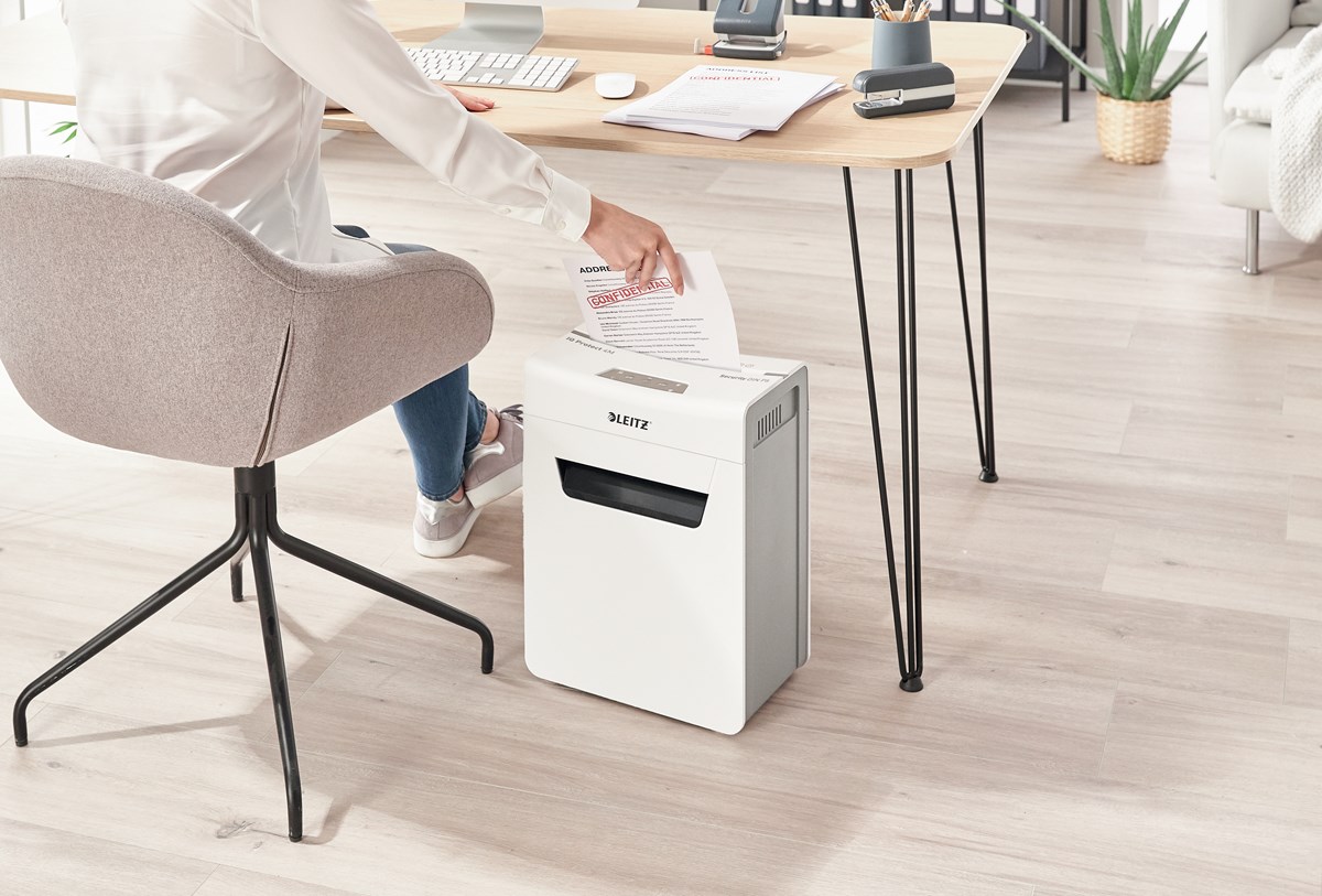 Dokumentförstörare med prisbelönt design för personligt bruk eller när makuleringsbehovet är litet. AntiJam-teknik för makulering utan pappersstopp. Extremt tyst drift gör modellen perfekt även för hemmamiljö. De lättanvända pekreglagen gör att du enkelt kan strimla upp till 4 ark A4-papper på en gång. Säkerhetsklass: P5 2x15 mm. Strimlar häftklammer och gem. Avfallsbehållaren rymmer 14 liter (ca 125 ark). 10 minuters drifttid. Garanti 2 + 1 år. Vi rekommenderar att man använder oljeark var tredje gång man tömmer dokumentförstörarens avfallsbehållare.