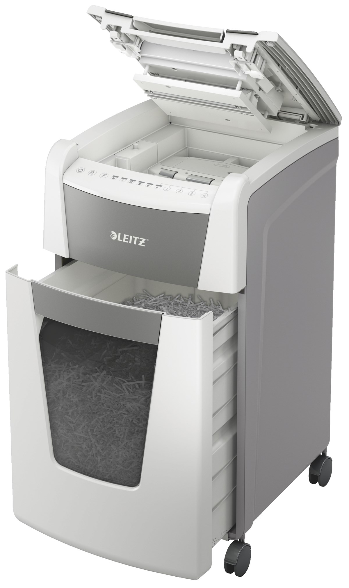 Automatisk makulering av upp till 300 A4-ark, fack för manuell arkmatning. Säkerhetsklass P4 (4x28 mm) destruerar smidigt känslig data, även personuppgifter. AntiJam. Tyst drift upp till 60 minuter, 55 dBA. Viloläge efter 3 minuters inaktivitet. Varning när 20% av behållarkapacitet kvar. Strimlar häftklammer, gem och plastkort. Mått: 415 x 735 x 465 mm. Garanti 2 + 1 år. Vi rekommenderar att man använder oljeark var tredje gång man tömmer dokumentförstörarens avfallsbehållare.