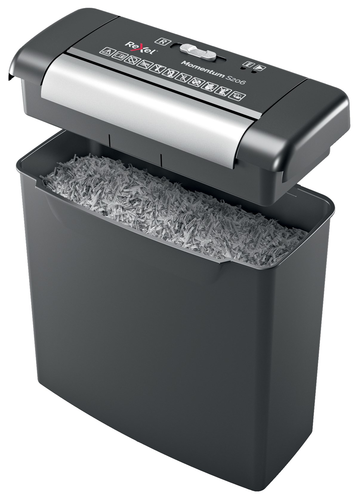 Med kraft att makulera mer! Rexel Momentum S206 dokumentförstörare makulerar upp till 6 ark i en inmatning med en kontinuerlig driftstid på 2 minuter, vilket gör den idealisk för användning i hemmet. P2, strimmelskärning 6 mm breda remsor, 9 liters avfallsbehållare (75 x A4 ark) Mått: 156x288x319 mm. Vi rekommenderar att man använder oljeark var tredje gång man tömmer dokumentförstörarens avfallsbehållare.