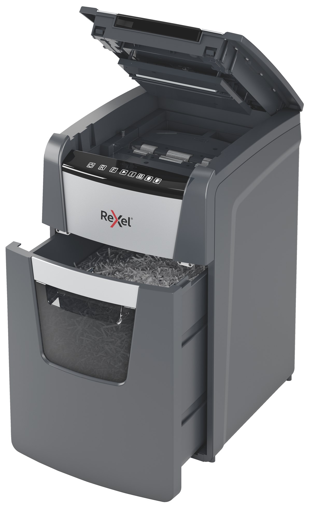 Makulerar upp till 150 A4-ark automatiskt, separat fack för manuell arkmatning. Säkerhetsklass P4 (4x28 mm) garanterar säker destruering av känslig data, rymlig avfallsbehållare och upp till 30 minuters drifttid gör hanteringen smidig. Energisnål: viloläge efter 3 minuters inaktivitet. 55 dBA. AntiJam. Strimlar häftklammer, gem och plastkort. 2 års garanti. Vi rekommenderar att man använder oljeark var tredje gång man tömmer dokumentförstörarens avfallsbehållare.