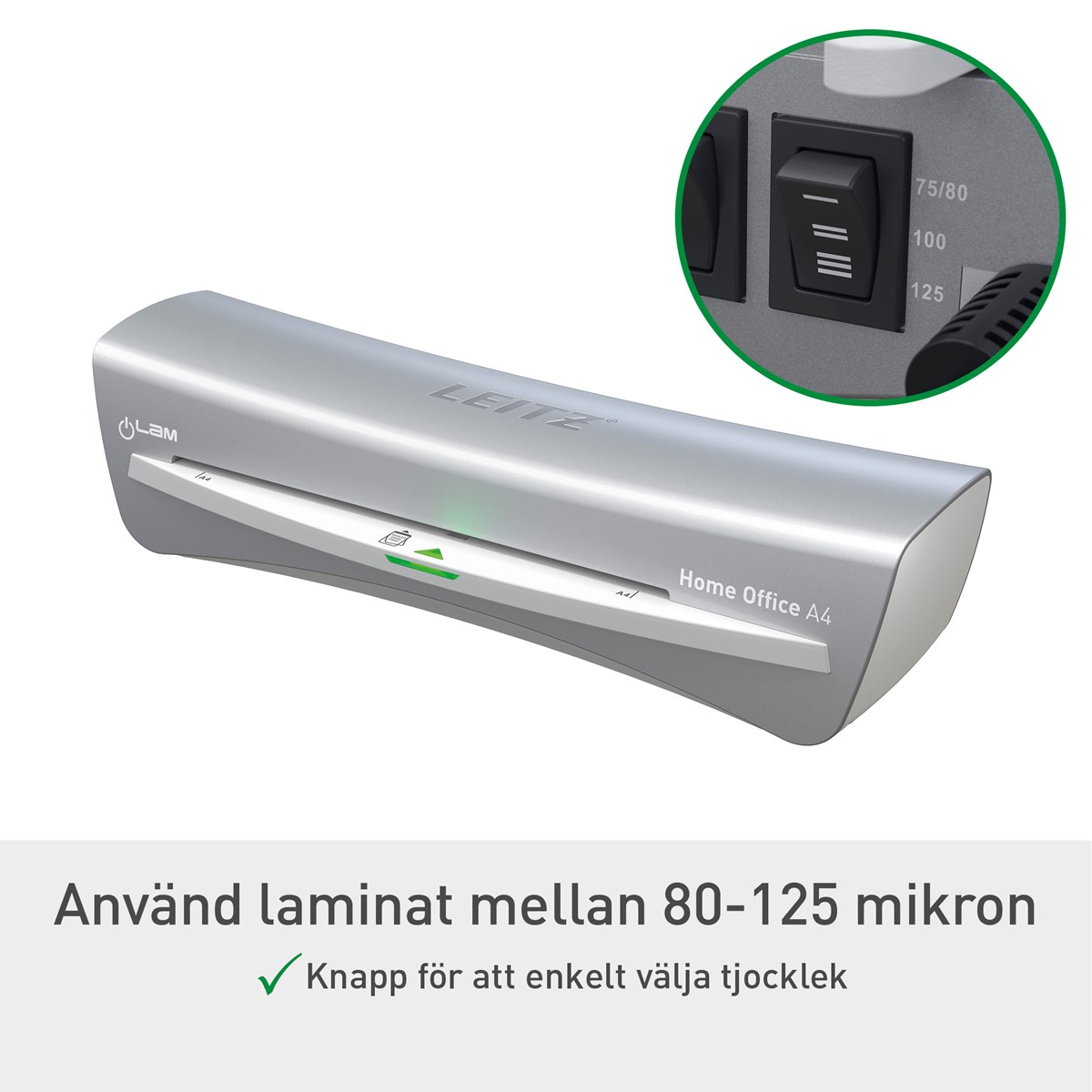 Den eleganta och kompakta lamineringsmaskinen Leitz iLAM Home Office kombinerar modern design med funktionalitet. Denna A4-laminator är utformad för bekvämlighet och har en snabb uppvärmningstid på 2 minuter och kan laminera ett 80-mikron A4-ark på bara 45 sekunder. Med ett enkelt knapptryck väljer du mellan tre olika ficktjocklekar för att passa olika behov, från vardagsdokument till viktiga papper som ska hålla länge. Den manuella anti-jam-frigöringsspaken säkerställer problemfri drift genom att snabbt lösa eventuella stopp. Den innovativa smarta status-LED:n gör användningen enklare med intuitiva ljus och ljud: rött under uppvärmning, grönt med en ljudsignal när den är redo och blinkande rött för standby-läge efter 15 minuters inaktivitet. Skydda dina dokument snabbt, effektivt och med stil.