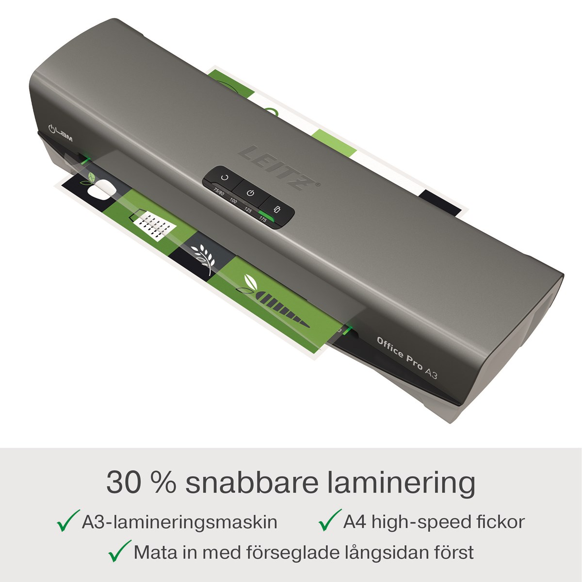 Laminerar ett A4-dokument med 80 mikrometer på cirka 23 sekunder och är även kompatibel med A4-höghastighetsfickor för ökad produktivitet.