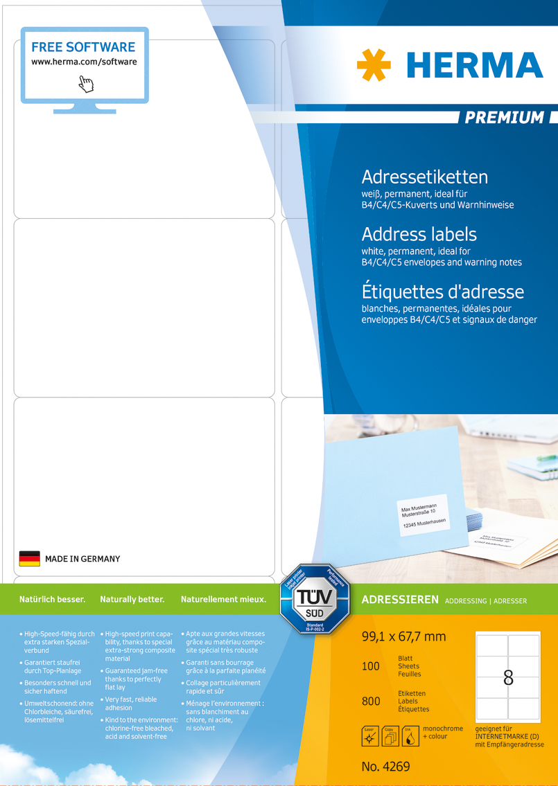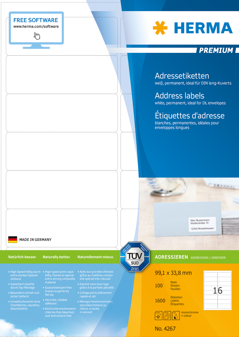 Problemfria utskrifter, testat och bekräftat av TÜV SÜD. Extra kraftiga etiketter – lätta att lossa och fästa. Fäster säkert även på kalla och fuktiga ytor. Hög vithetsgrad och jämn yta för bästa utskriftsresultat i svart och färg. Blekt utan klor, syrafritt och lim utan lösningsmedel. För laser, bläckstråle och kopiatorer. 100 A4-ark/förp.