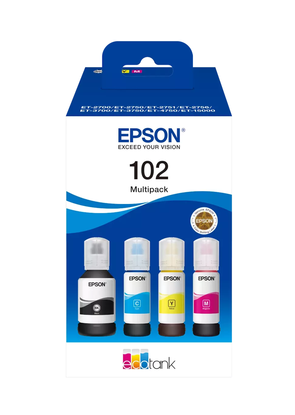 Upptäck bläckuppsättning 102 – den är problemfri, till en extremt låg kostnad, och kladdar inte. Detta färgämnesbaserade bläck i fyra färger innehåller även pigment och är perfekt för att framställa dokument med hög kvalitet. Med en enda uppsättning bläck kan du skapa tusentals sidor utan att behöva byta en enda patron. Det är prisvärt också – när du köper en EcoTank-skrivare kan du spara i genomsnitt upp till 90 % av utskriftskostnaderna. 337 ml.