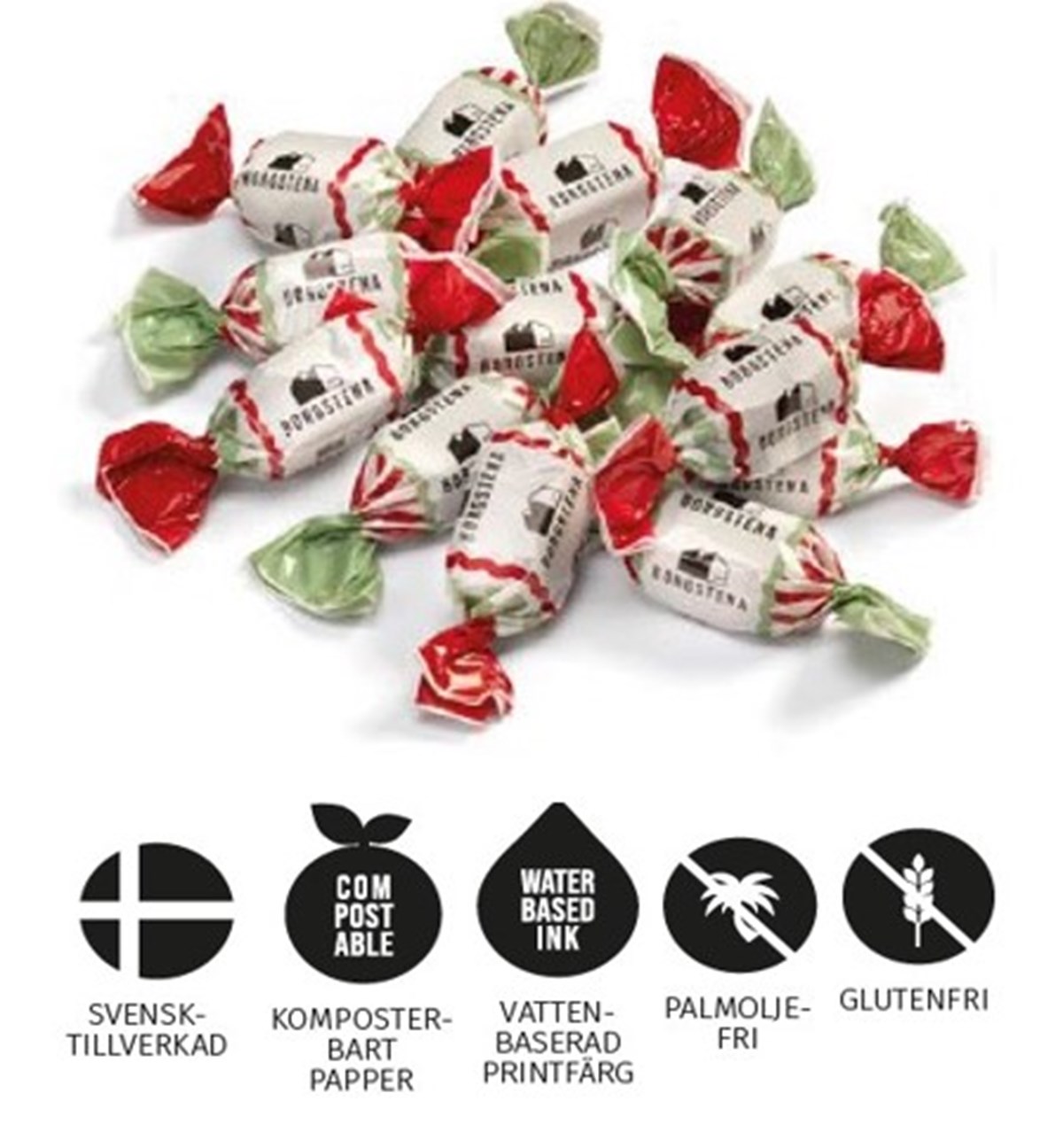Cellofanpåse av återvunnen plast med ryttare i FSC-certifierat papper fylls med en härlig julmix av chokladdragerad kola från Borgstena. Smakerna är caramel och lakrits vilket ger en härlig baldning av sött och salt. Det twistade pappret är även komposterbart. Tryck din logga eller ditt budskap på produkten.