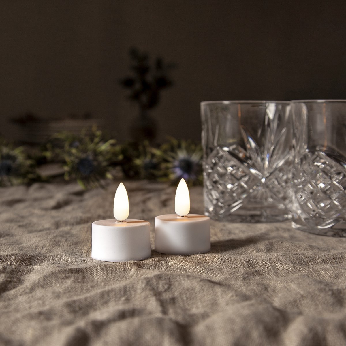 Värmeljus i LED med en varmvit låga. Brinntid ca 80 timmar. Med inbyggd timer. 6 timmar på, 18 timmar av, repeterande. Drivs med 2 st CR2032-batterier (ingår).