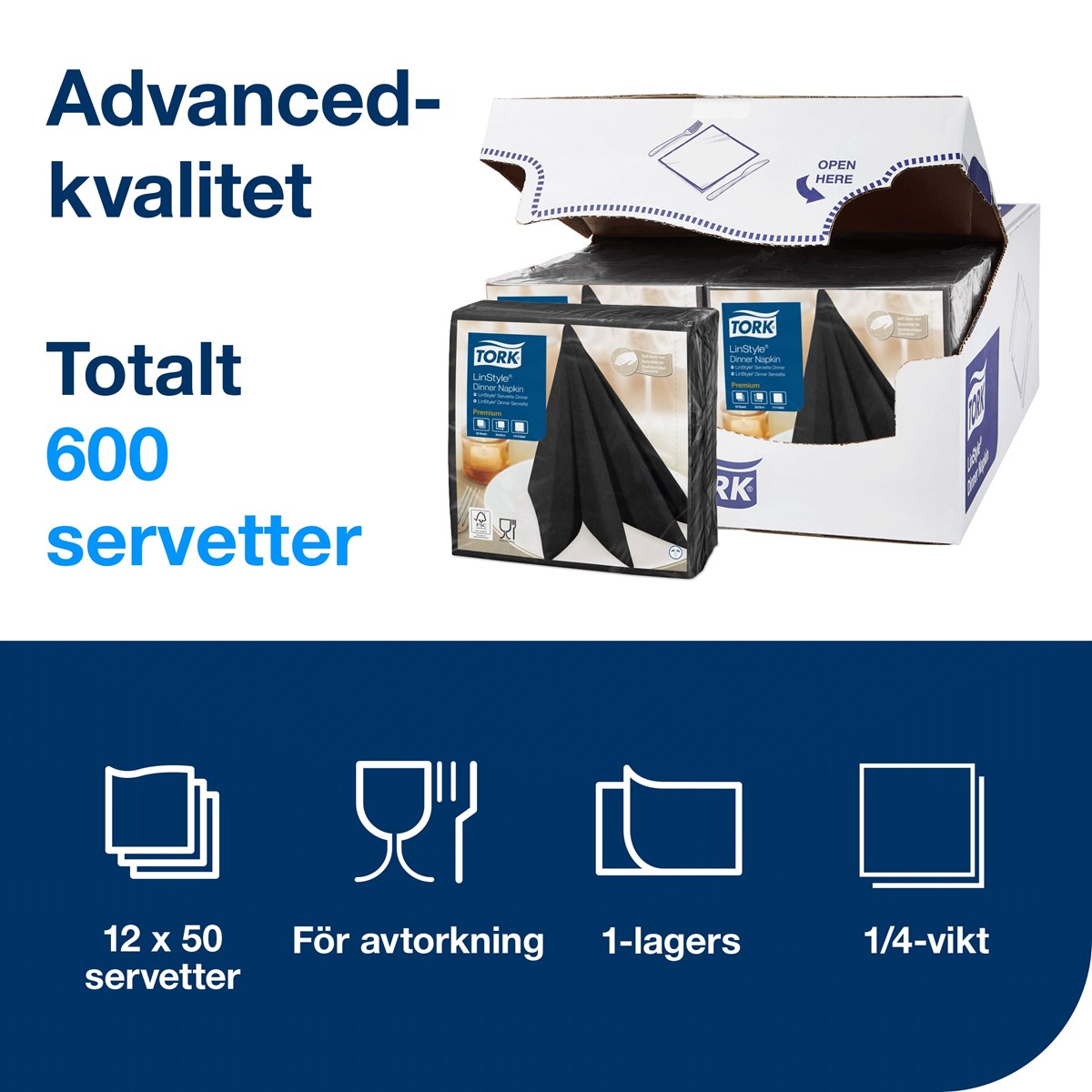 Gör ett fantastiskt första intryck i fullbetjäningsrestauranger med högkvalitativa LinStyle® Middagsservett. Med sin känsla av linne är den mjukare och tjockare än vanliga pappersservetter och ger ett elegant intryck. Suverän hållbarhet gör att restaurangservetterna varar under hela middagen, vilket minskar kostnader och förbrukning. Samtidigt ser den höga absorptionsförmågan till att personal enkelt kan städa upp spill. Med engångsservetter slipper personalen också tvättbesvären som kommer med textilservetter. 1-lagers. Premium-kvalitet. Mått vikt: 19,5x19,5 cm. Mått ovikt: 39x39 cm.
