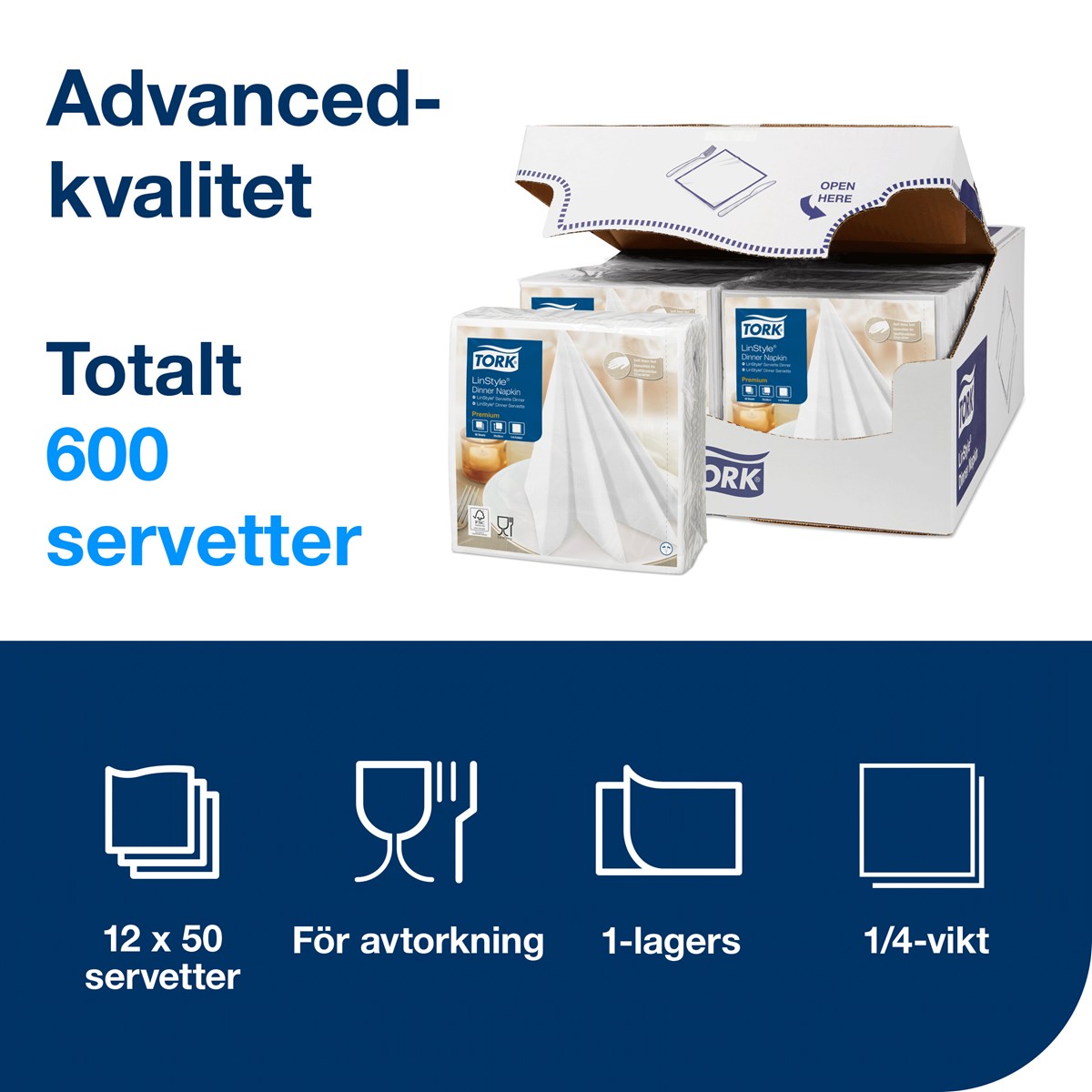 Gör ett fantastiskt första intryck i fullbetjäningsrestauranger med högkvalitativa LinStyle® Middagsservett. Med sin känsla av linne är den mjukare och tjockare än vanliga pappersservetter och ger ett elegant intryck. Suverän hållbarhet gör att restaurangservetterna varar under hela middagen, vilket minskar kostnader och förbrukning. Samtidigt ser den höga absorptionsförmågan till att personal enkelt kan städa upp spill. Med engångsservetter slipper personalen också tvättbesvären som kommer med textilservetter. 1-lagers. Premium-kvalitet. Mått vikt: 19,5x19,5 cm. Mått ovikt: 39x39 cm.