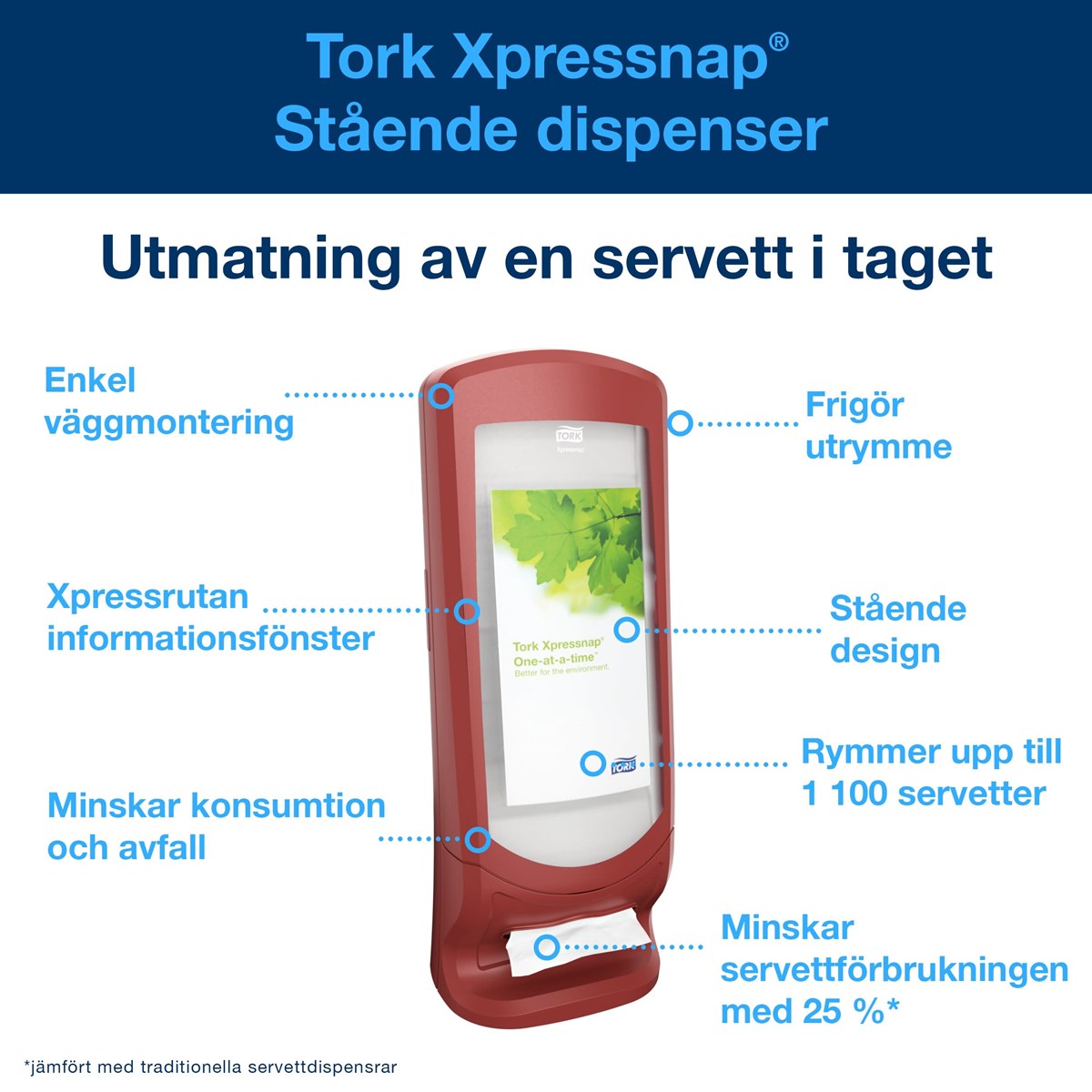 Stående servettdispenser som också kan hängas på väggen. Placera eget budskap i reklamrutan. Hög kapacitet – rymmer 1100 N4-servetter. Format: H62,2 x B23,5 x D23,5 cm.