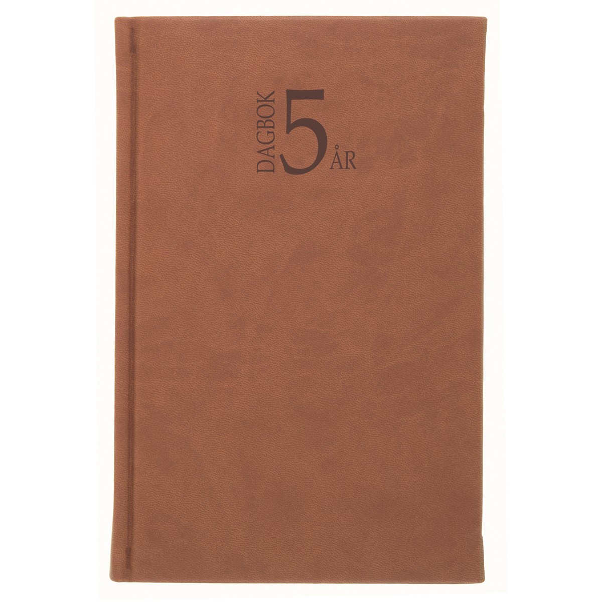 Årsneutral dagbok som sträcker sig över fem år. Inbunden. Namnsdagsregister. Cognacsfärgat konstläder. Format: 142 x 205 mm.
