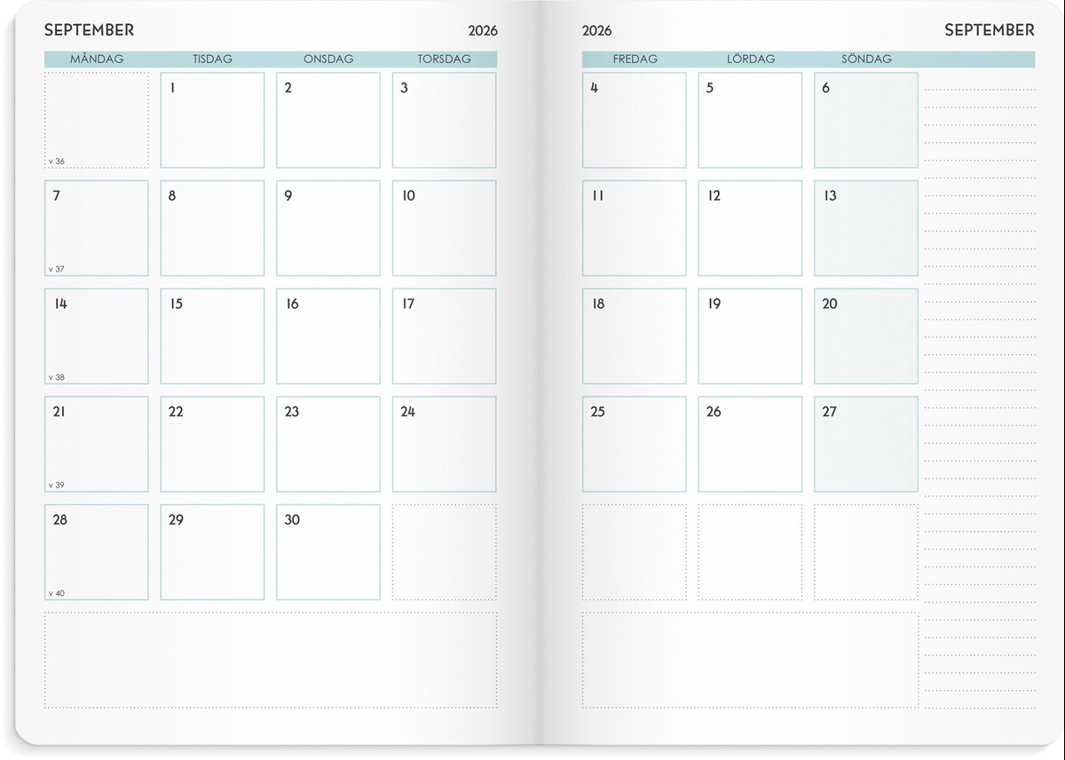 Format: A5. Layout: Stående. Vecka/uppslag. Kalendarium: 2025-12-15 - 2027-01-03. Omslag: Kartong. Inbunden. Detaljer: Gummiband. Märkband. Innehåll: Flaggdagar, Helgdagar/aftnar, Månfaser, Namnsdagar, Temadagar/händelser, Årsöversikt/årsöversikter, Årsplan/årsplaner. Antal sidor: 160. Miljöinformation: FSC®.