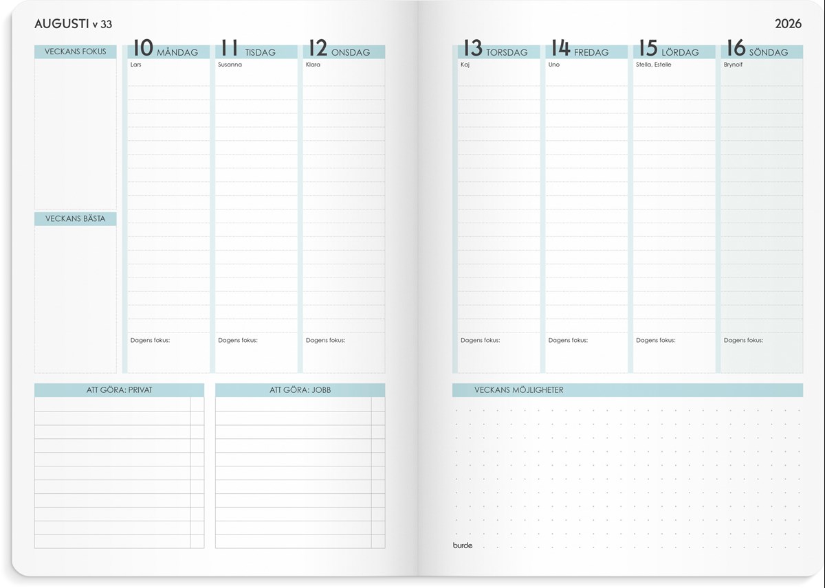 Det är en konst att hitta och behålla fokus! Med Burdes Life Planner Focus får du hjälp att planera det som ska göras i vardagen och på jobbet. Genom att ägna lite mer tid åt din planering kan du bli mer effektiv och hitta tid för det du vill fokusera lite extra på. Kalendern har mjukt kartongomslag med vecko- och månadsplanering.
