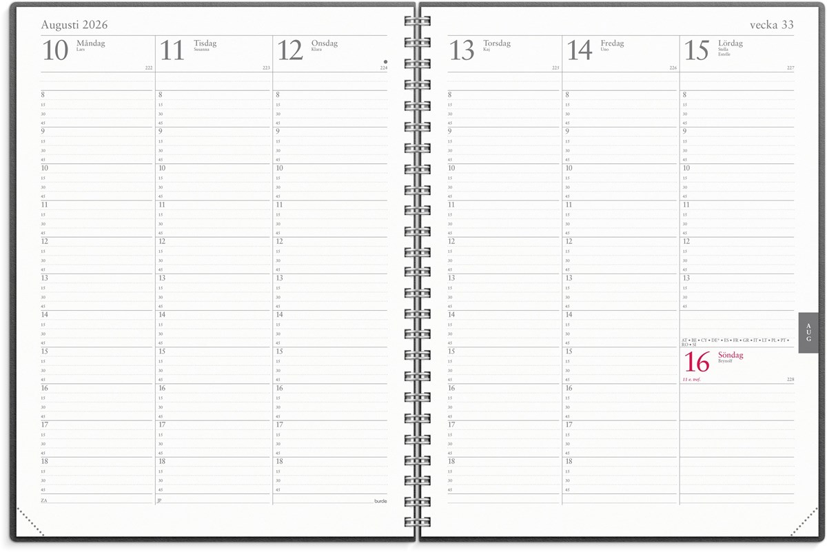 Format: 192x260 mm. Layout: Stående. Vecka/uppslag. Kvartsindelning 8-19. Kalendarium: 2025-12-29 - 2027-01-03. Omslag: Kartong. Spiralbunden. Innehåll: Kyrkliga helgdagar, Flaggdagar, Helgdagar/aftnar, Internationella helgdagar, Månfaser, Namnsdagar, Internationella helgdagar översikt, Temadagar/händelser, Årsöversikt/årsöversikter, Årsplan/årsplaner. Antal sidor: 368. Miljöinformation: FSC®.