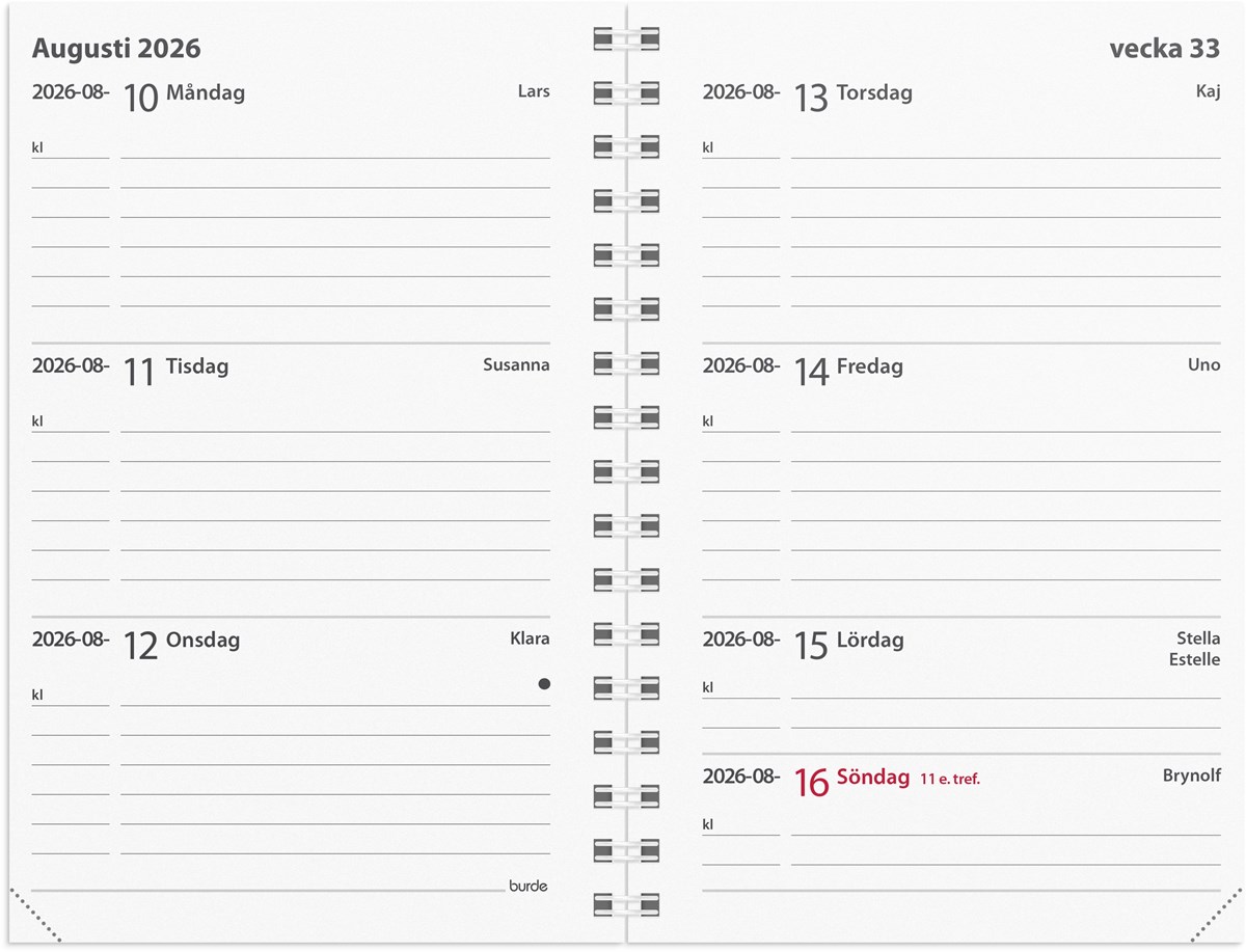 Format: 83x127 mm. Layout: Liggande. Vecka/uppslag. Kalendarium: 2025-12-15 - 2027-01-03. Omslag: Kartong. Spiralbunden. Innehåll: Atlas, Kyrkliga helgdagar, Flaggdagar, Helgdagar/aftnar, Månfaser, Namnsdagar, Internationella helgdagar översikt, Temadagar/händelser, Årsöversikt/årsöversikter, Årsplan/årsplaner. Antal sidor: 152. Miljöinformation: FSC®.