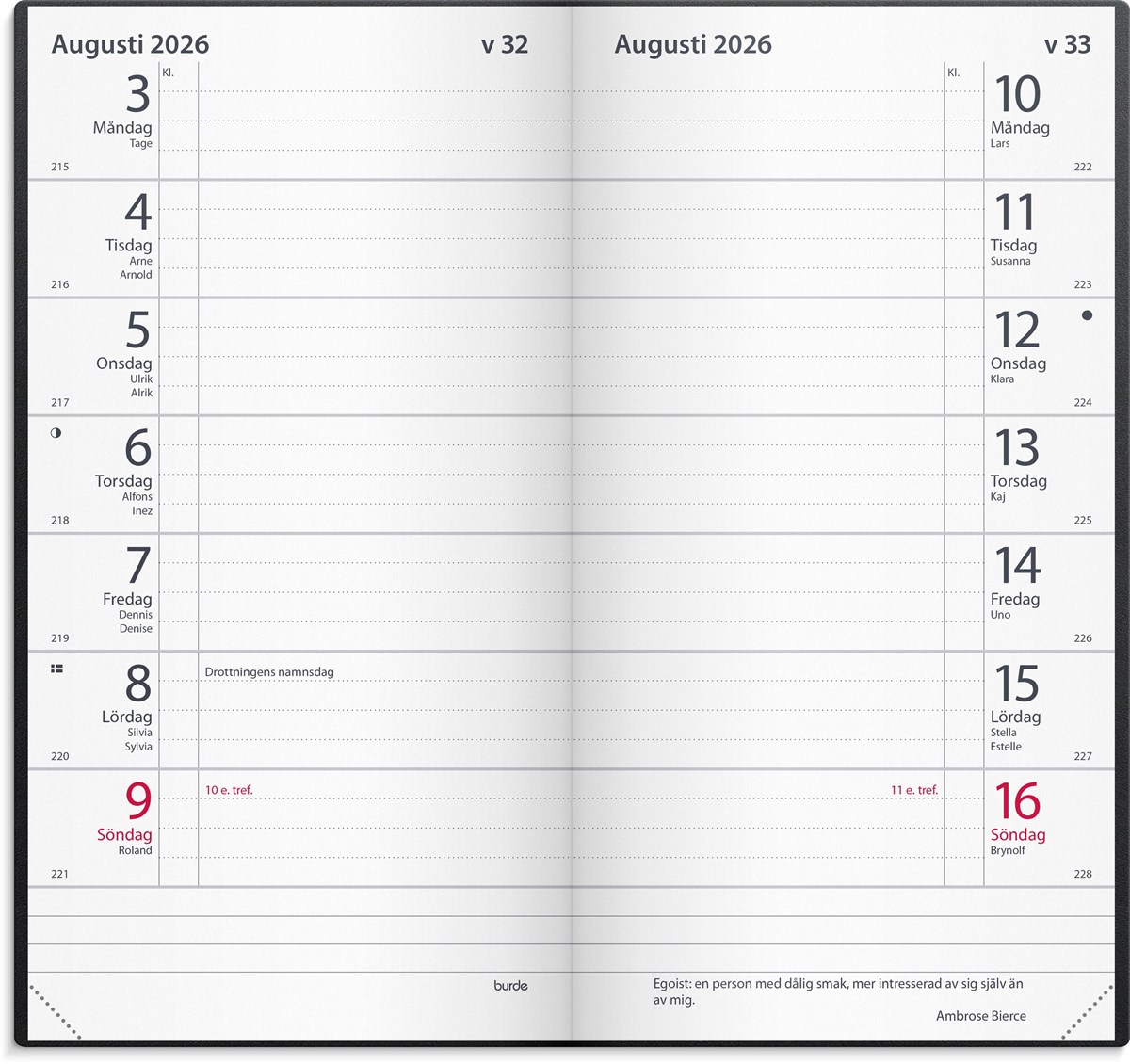 Format: 85x158 mm. Layout: Liggande. Två veckor/uppslag. Kalendarium: 2025-12-22 - 2027-01-03. Omslag: Plast. Häftklamrad. Innehåll: Kyrkliga helgdagar, Flaggdagar, Helgdagar/aftnar, Månfaser, Namnsdagar, Religiösa högtider inom islam och judendom, Telefonregister, Temadagar/händelser, Årsöversikt/årsöversikter, Årsplan/årsplaner. Antal sidor: 64. Miljöinformation: FSC®.