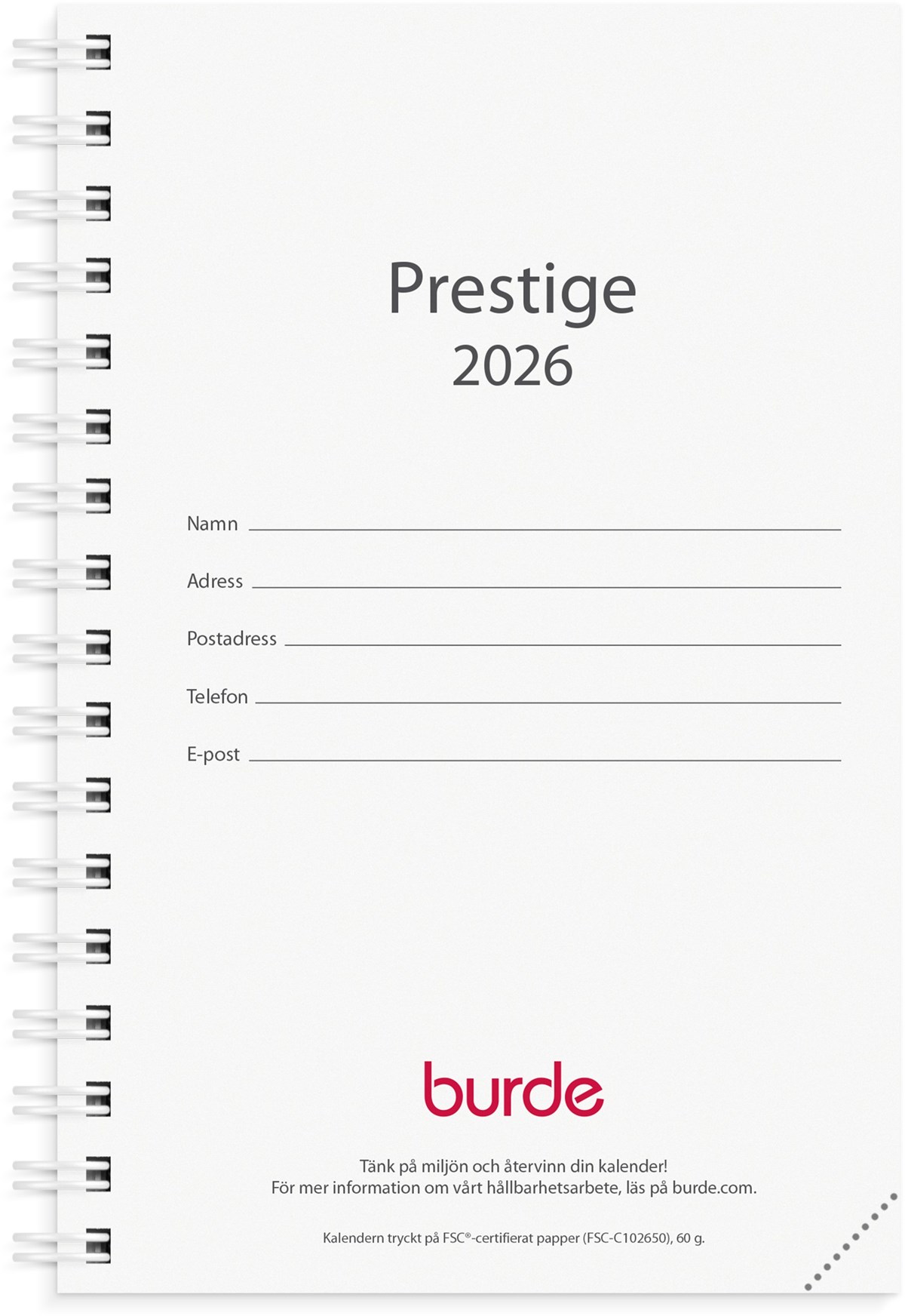 Format: 83x127 mm. Layout: Stående. Vecka/uppslag. Timindelning 7-21. Kalendarium: 2025-12-08 - 2027-01-03. Omslag: Kartong. Spiralbunden. Innehåll: Atlas, Kyrkliga helgdagar, Flaggdagar, Helgdagar/aftnar, Månfaser, Namnsdagar, Internationella helgdagar översikt, Temadagar/händelser, Årsöversikt/årsöversikter, Årsplan/årsplaner. Antal sidor: 152. Miljöinformation: FSC®.