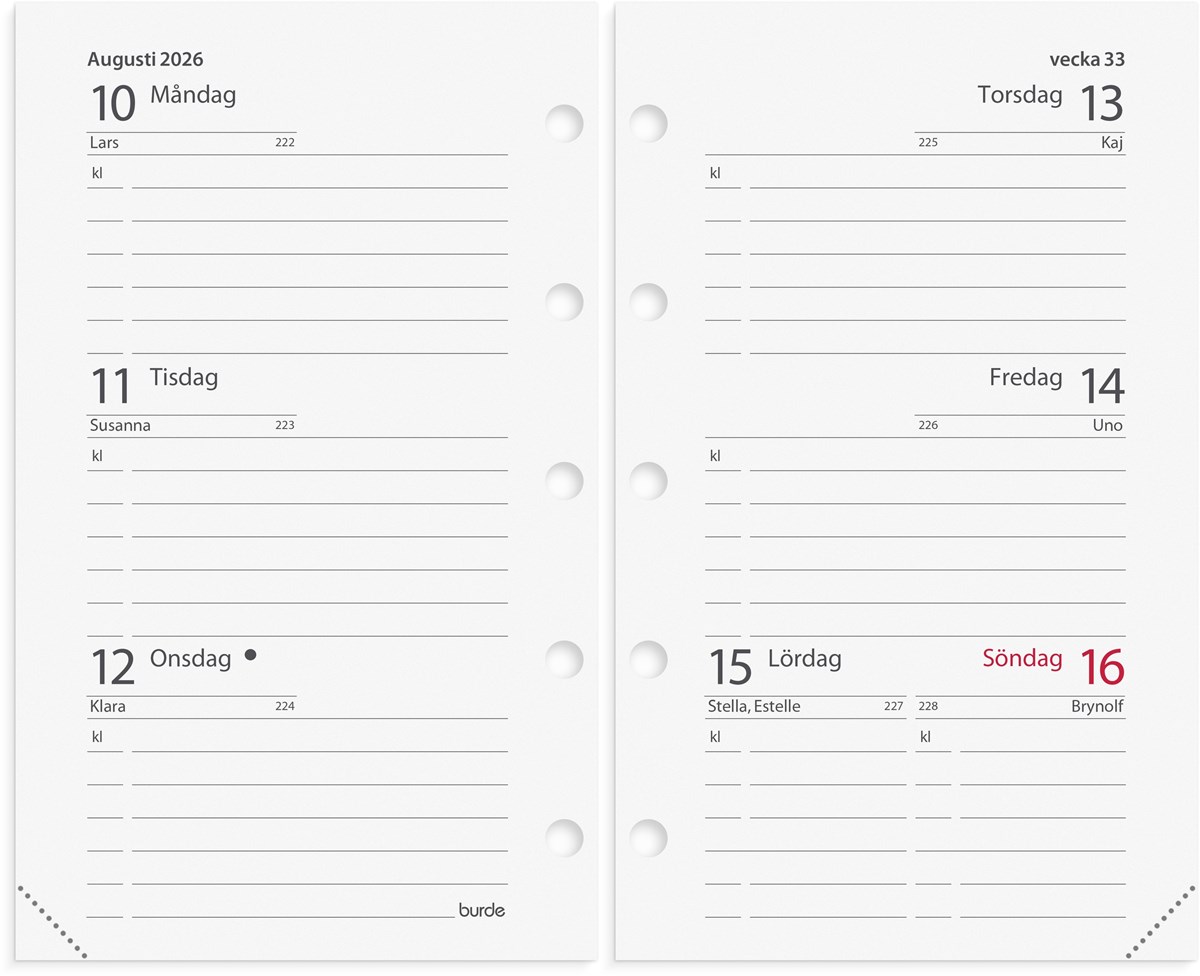 Hålad kalenderrefill till systemkalender med ringmekanism.