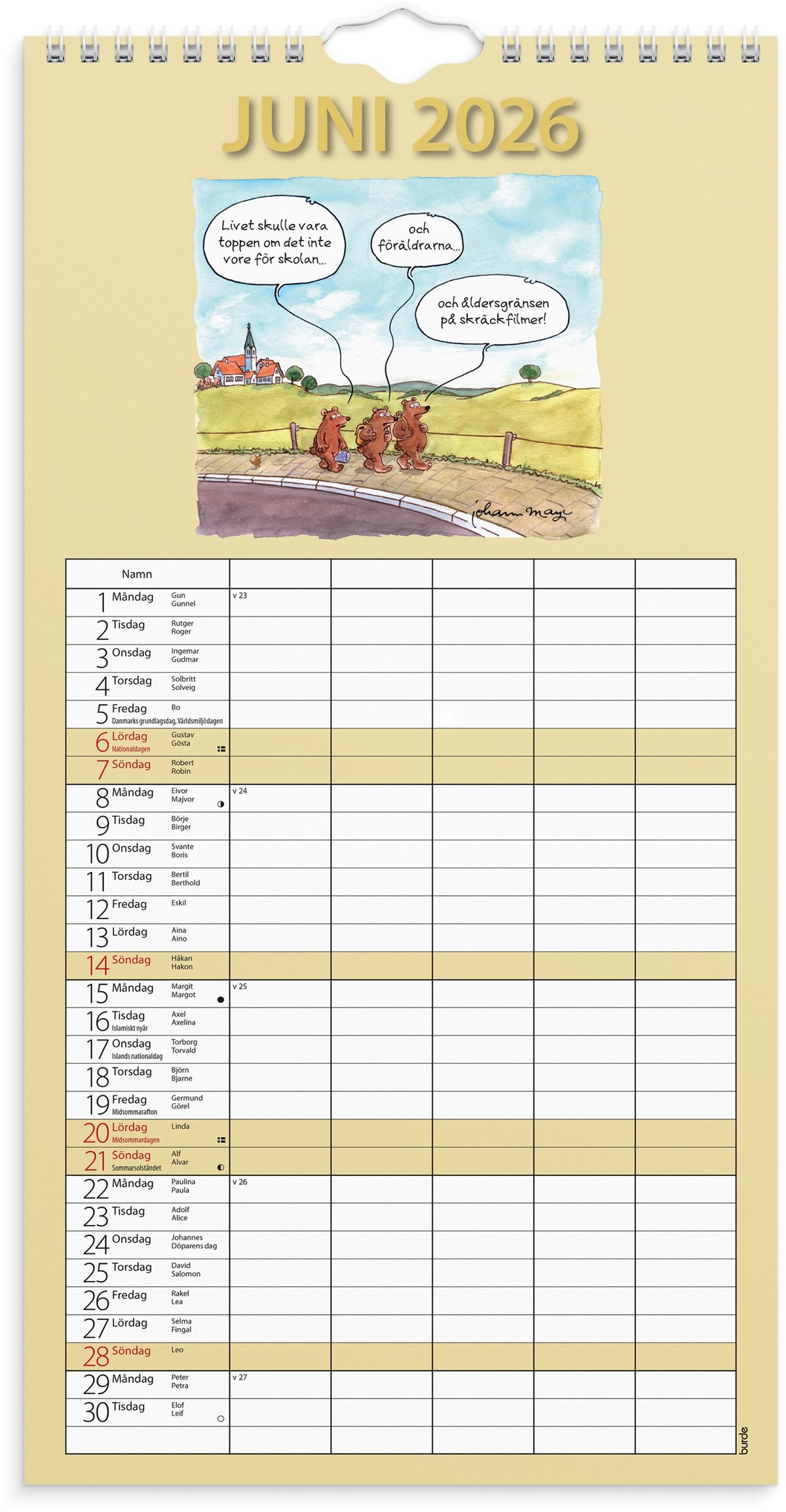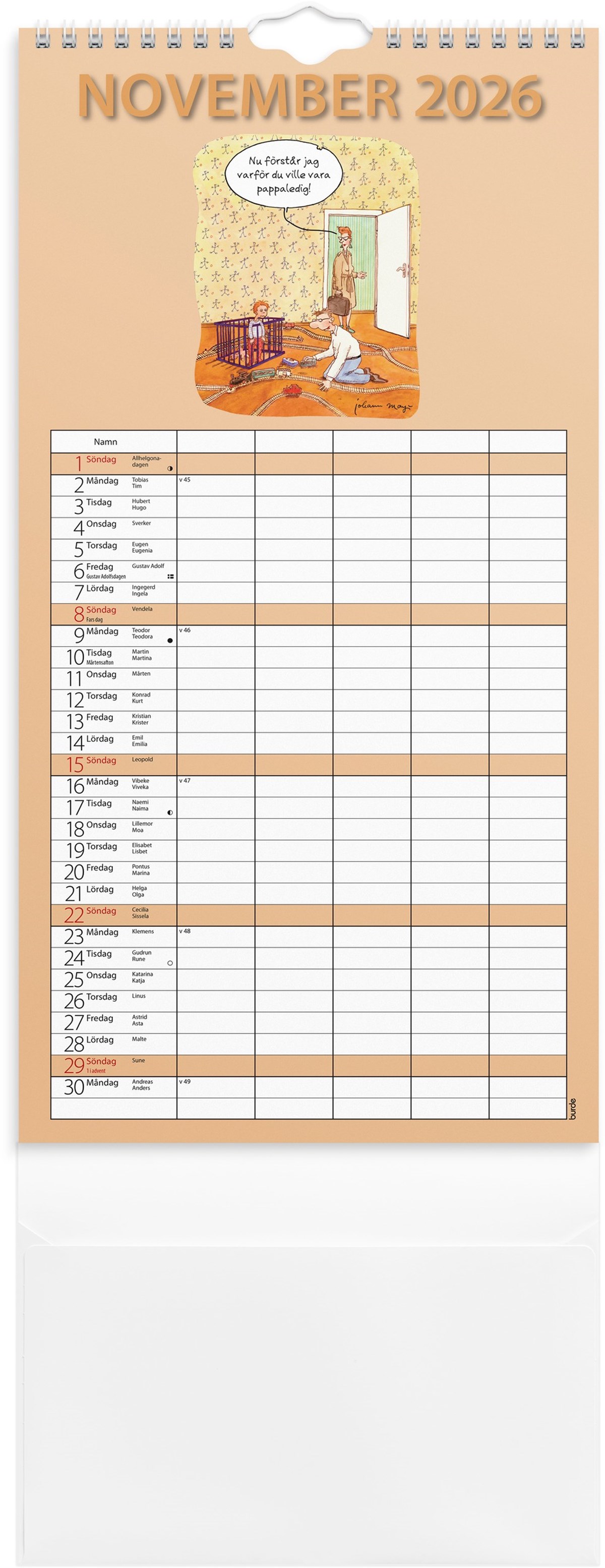 FamiljeFormat: 220x430 mm. Layout: Månad/blad. Kalendarium: 2026-01-01 - 2026-12-31. Spiralbunden. Detaljer: Pappersficka. Innehåll: 5 kolumner, Flaggdagar, Helgdagar/aftnar, Månfaser, Namnsdagar, Temadagar/händelser. Antal sidor: 12. Miljöinformation: FSC®.