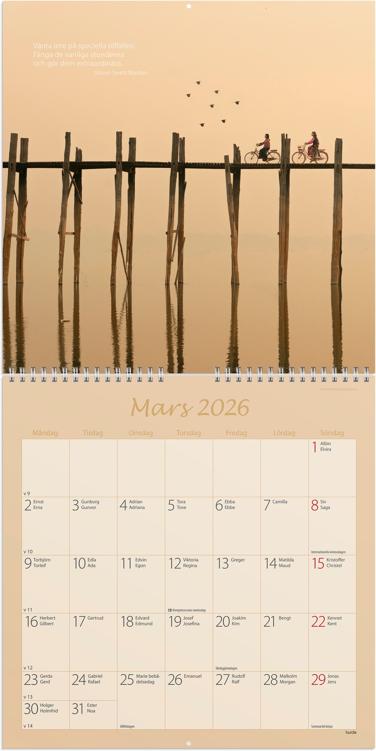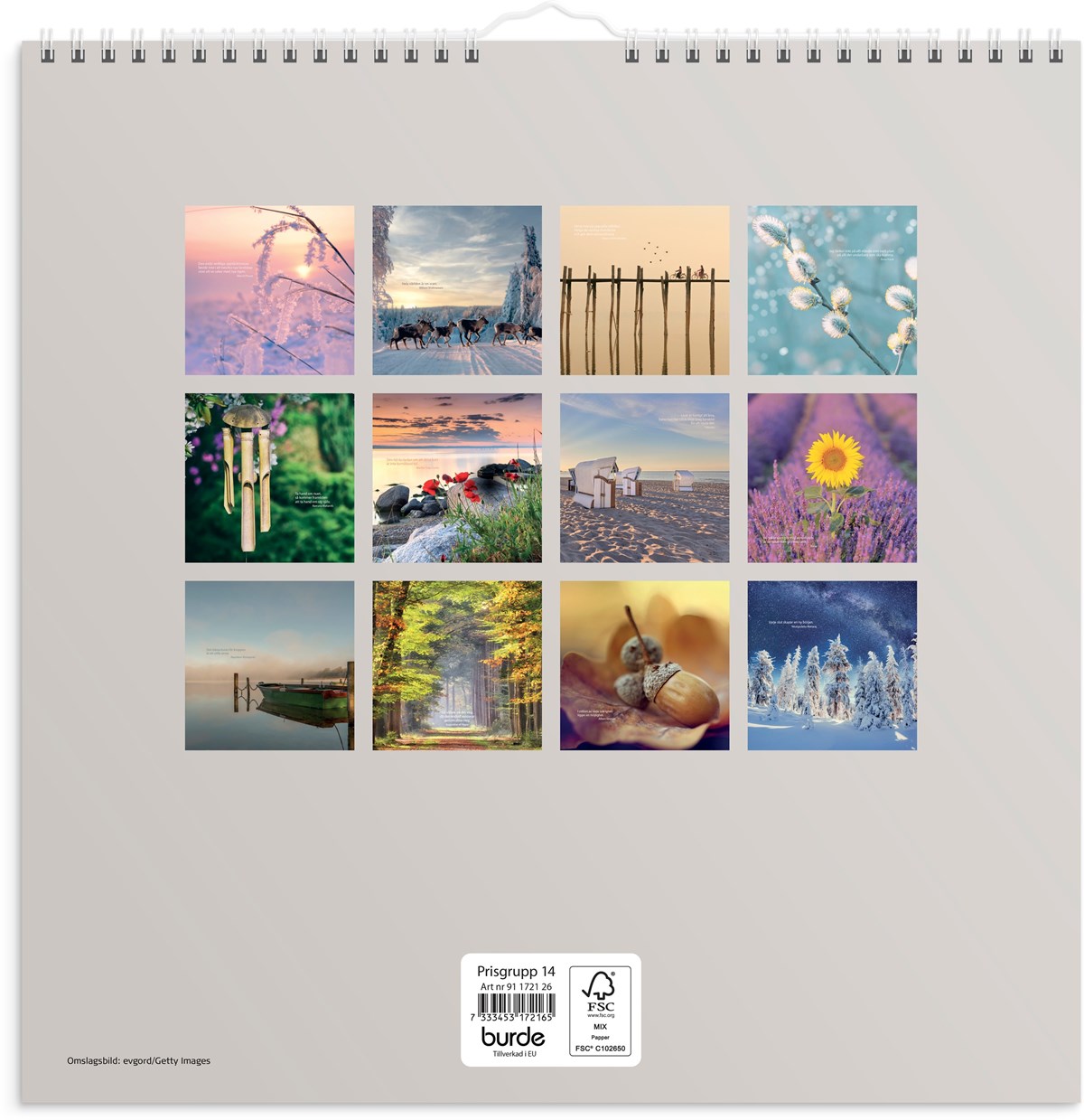 Format: 300x300 mm. Layout: Månad/blad. Kalendarium: 2026-01-01 - 2026-12-31. Spiralbunden. Innehåll: Flaggdagar, Helgdagar/aftnar, Namnsdagar, Temadagar/händelser. Antal sidor: 12. Miljöinformation: FSC®.