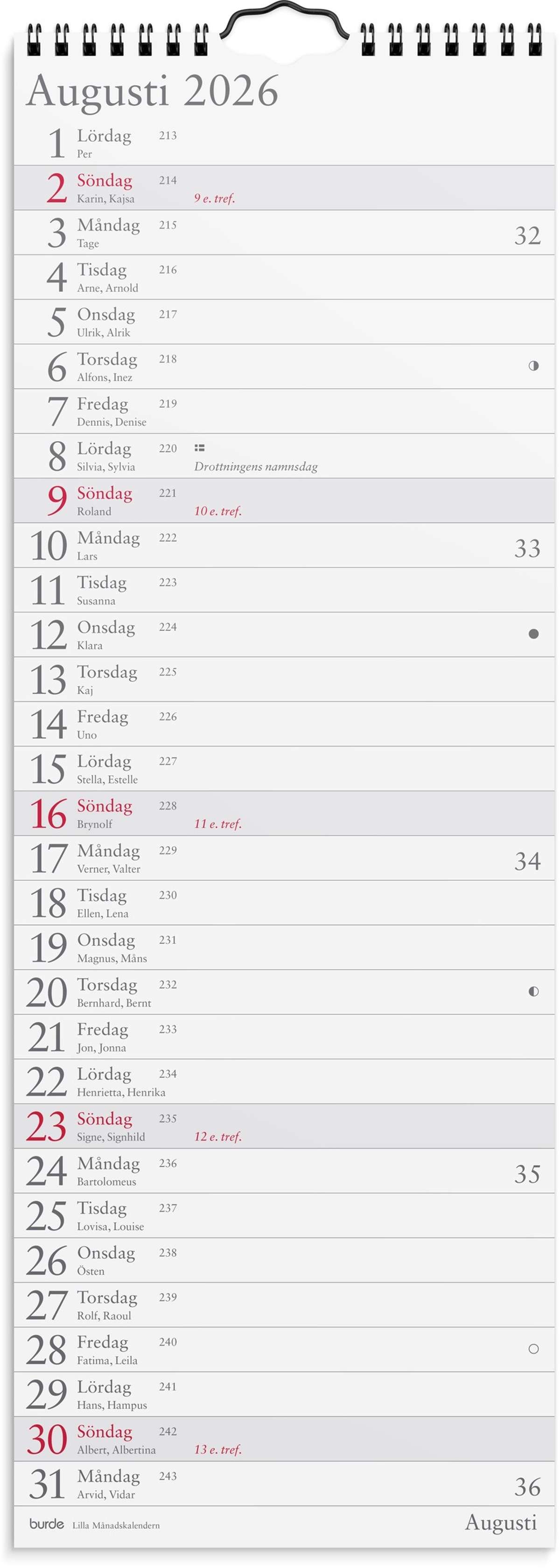 Format: 175x490 mm. Layout: Månad/blad. Kalendarium: 2026-01-01 - 2026-12-31. Spiralbunden. Innehåll: Kyrkliga helgdagar, Flaggdagar, Helgdagar/aftnar, Månfaser, Namnsdagar, Temadagar/händelser. Antal sidor: 12. Miljöinformation: FSC®.