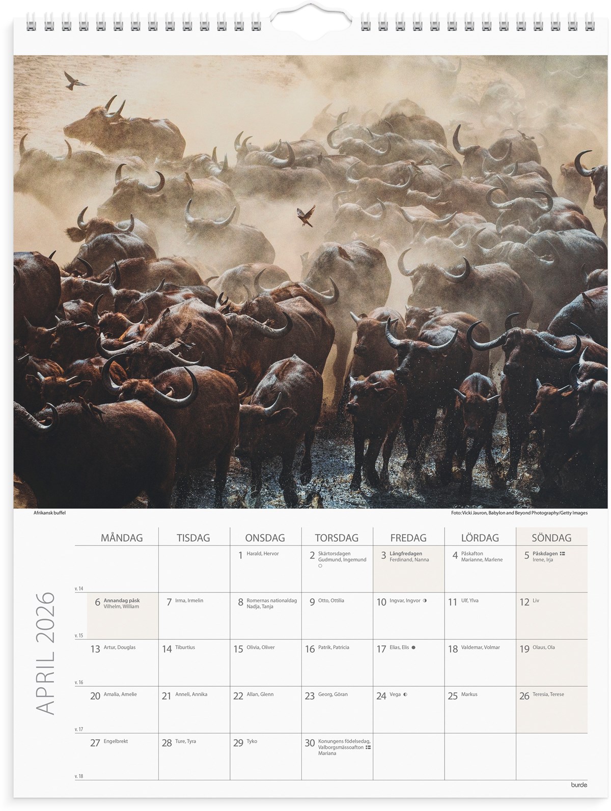 Format: 295x390 mm. Layout: Månad/blad. Kalendarium: 2026-01-01 - 2026-12-31. Spiralbunden. Innehåll: Flaggdagar, Helgdagar/aftnar, Månfaser, Namnsdagar, Temadagar/händelser. Antal sidor: 12. Miljöinformation: FSC®.
