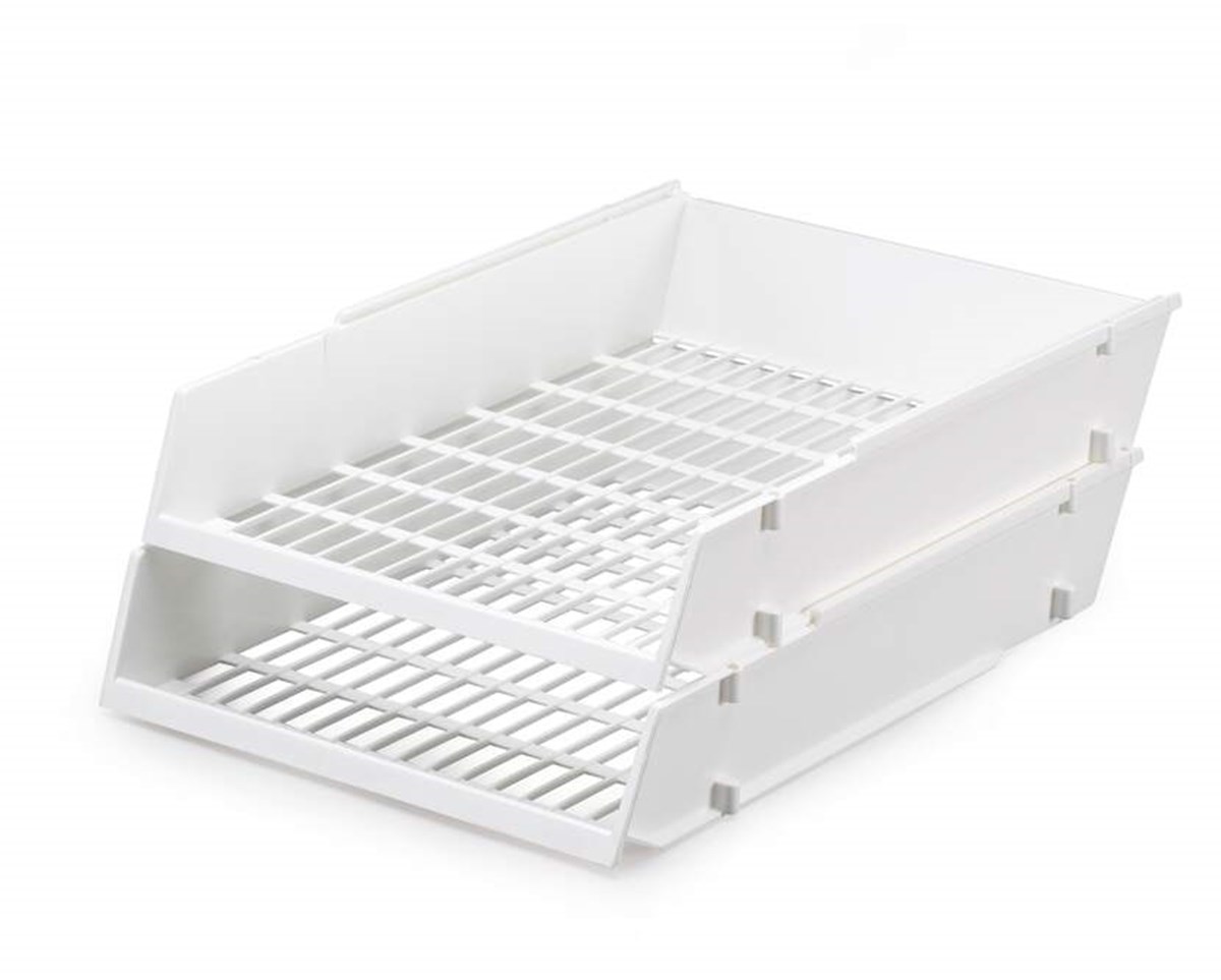 Staplingsbar, rymmer upp till C4-bredd. Invändigt format: 245 x 330 x 56 mm. Tillverkad i återvinningsbar styrenplast. 10 st/förp.