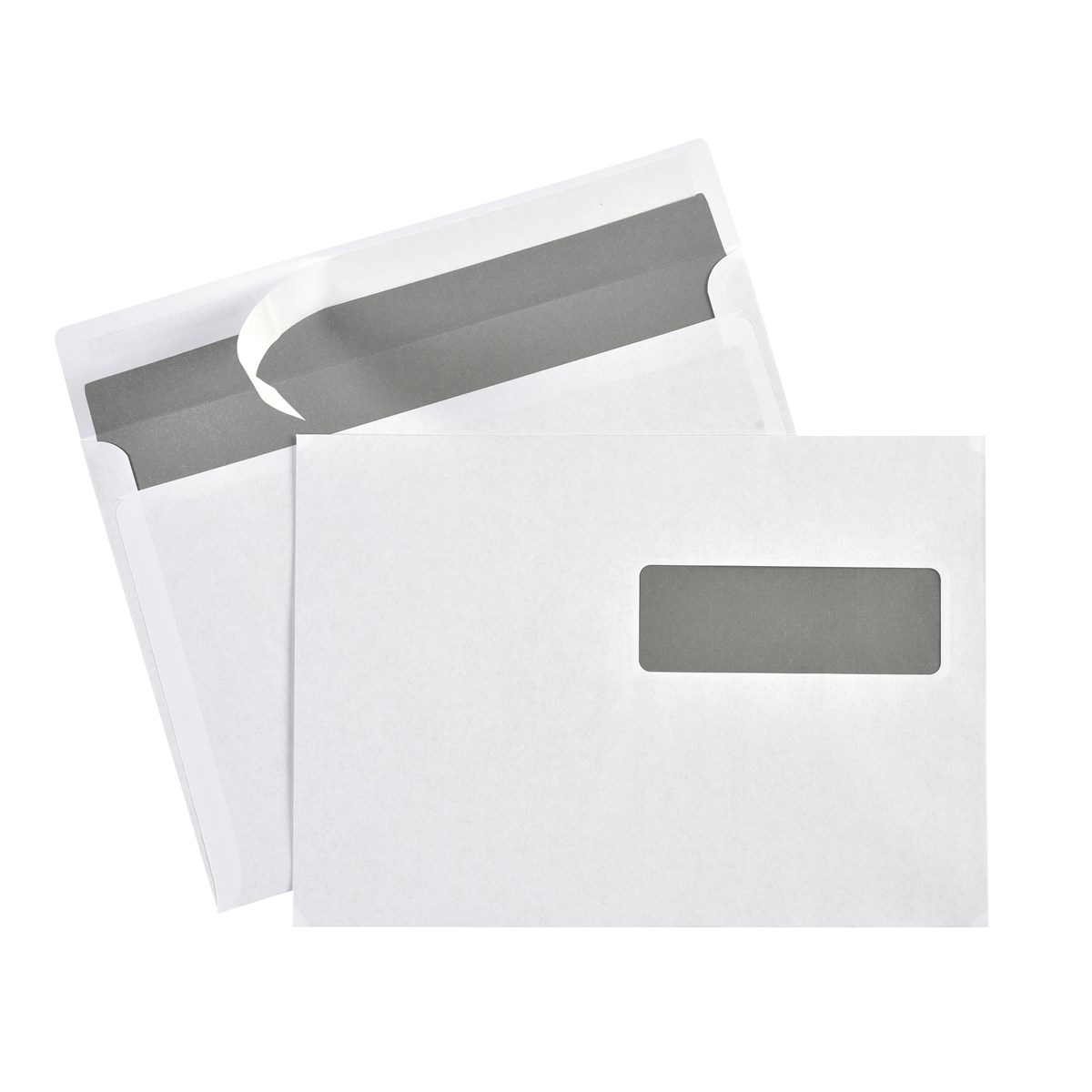 Självhäftande fönsterkuvert med Peel & Seal. Vitt kuvert med grått innertryck.