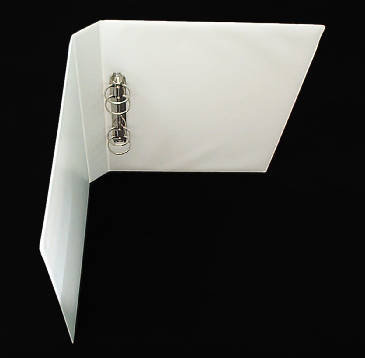 Ringpärm av vit propenplast och med kort triomekanism. Transparent ficka på framsida och rygg. A4-format.