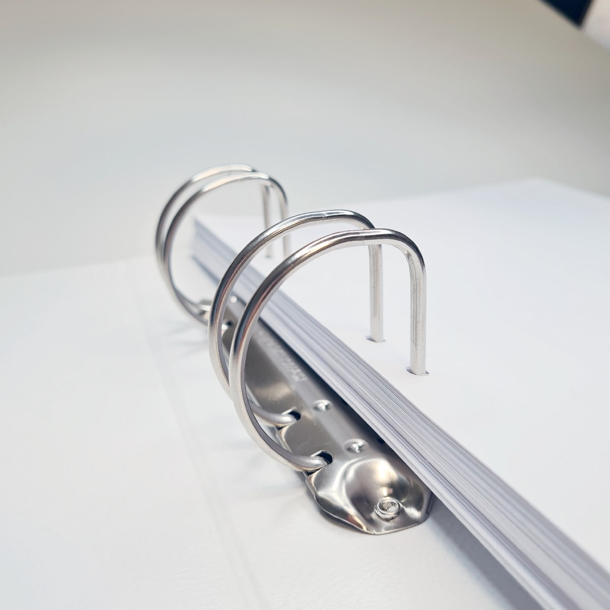 Högkvalitativ A4-pärm med transparent ficka på framsida och rygg. Kort triohålsmekanism på höger insida, pärmsidorna limmade på bägge sidor - inga luftbubblor. Ryggbredd 60 mm. 45 mm D-ringmekanism.