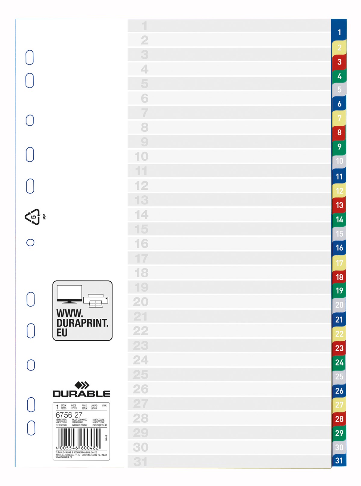 Pärmregister i PP-plast med olikfärgade blad samt försättsblad av kartong. Universalhålade. A4-format. 20 st/förp.