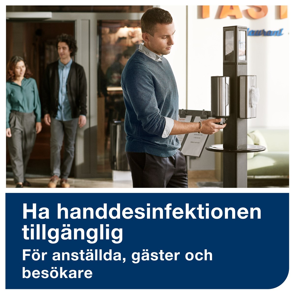 Stabilt golvställ som hjälper till att förbättra hygienen för anställda, gäster och besökare genom att ha handdesinfektion och servetter nära till hands. Plats för tre dispensrar. Passar Tork hållare S1, S2, S4 och F1. Mått ställ: 167,6 x 47 cm. Informationsfönster som träs på toppen med plats för ditt eget budskap finns som tillbehör.