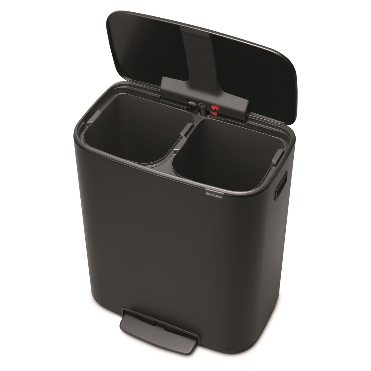 Pedalhink med två stycken separata innerhinkar, perfekt för att sopsortera i. Rektangulär och kan ställas mot en väg. Mjukstängande lock. Integrerande handtag gör den lätt att flytta. Mått B x D x H: 54,1 x 36,3 x 54,1 cm. Avfallspåse PerfectFit storlek O. 2 x 30 liter. 10 års garanti.