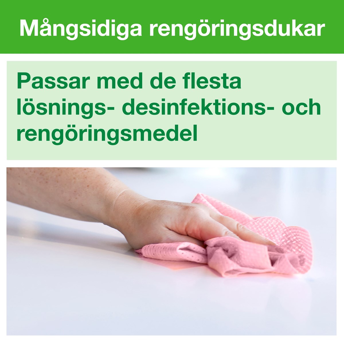 Allround-kvalitet som kan hantera allmän avtorkning Stark och absorberande Tillgänglig i fyra färger för att förhindra korskontaminering Lämplig för användning med de flesta rengöringsprodukter