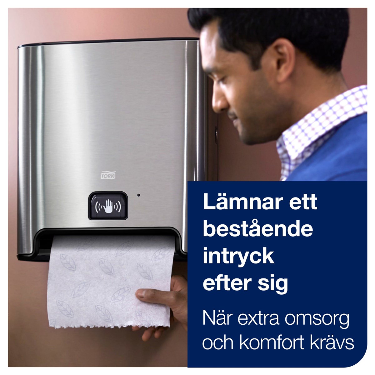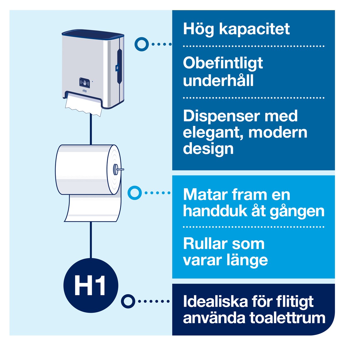 Rostfri, sensorstyrd hållare för handduksrullar. Känner av besökarens händer och matar då fram en handduk. Beröringsfri utmatning av en handduk i taget minskar förbrukningen och förbättrar hygienen. Enkelt underhåll med LED-påfyllningsindikatorn som visar när påfyllning behövs. Justerbar handdukslängd innebär att du kan välja den storlek som passar bäst i din verksamhet. Hög kapacitet. Mått: 37,3x34x20,4 cm. Drivs med tre 3 stycken LR20-batterier.
