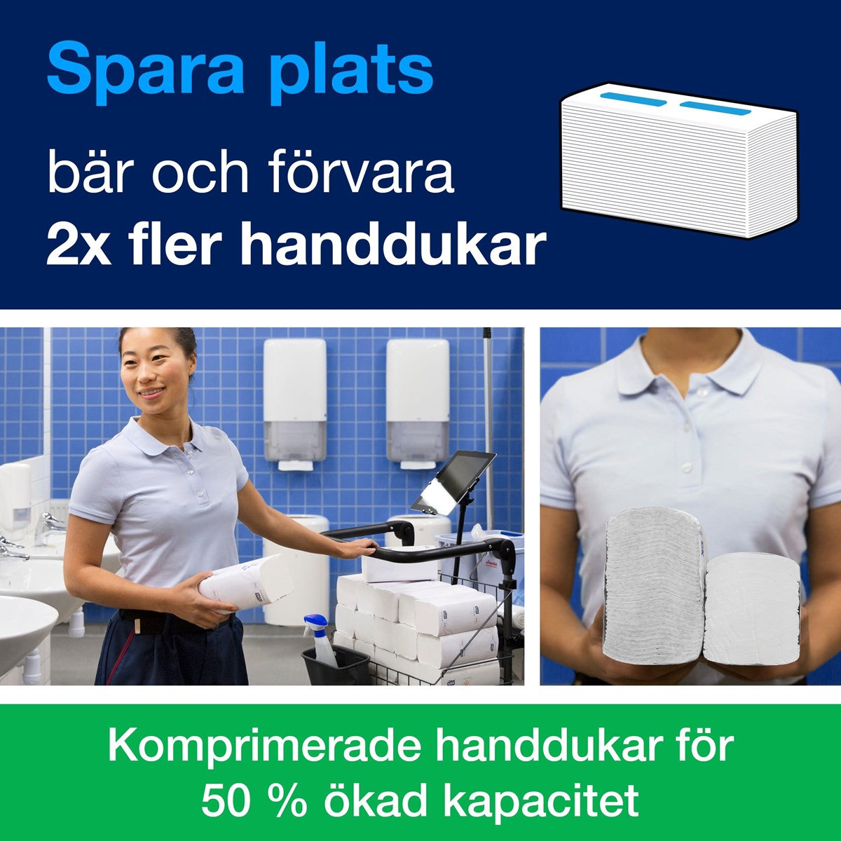 Handdukarna är komprimerade för en ökad kapacitet på 250% För välbesökta toalettutrymmen Smidig utmatning på tre sekunder Matar ut ett ark i taget vilket ger förbättrad hygien och minskad konsumtion