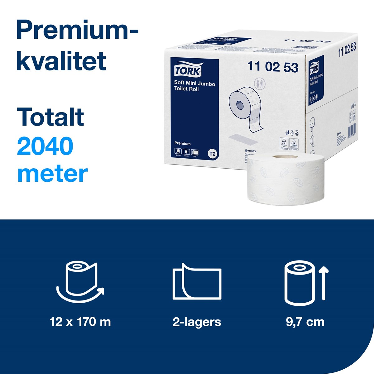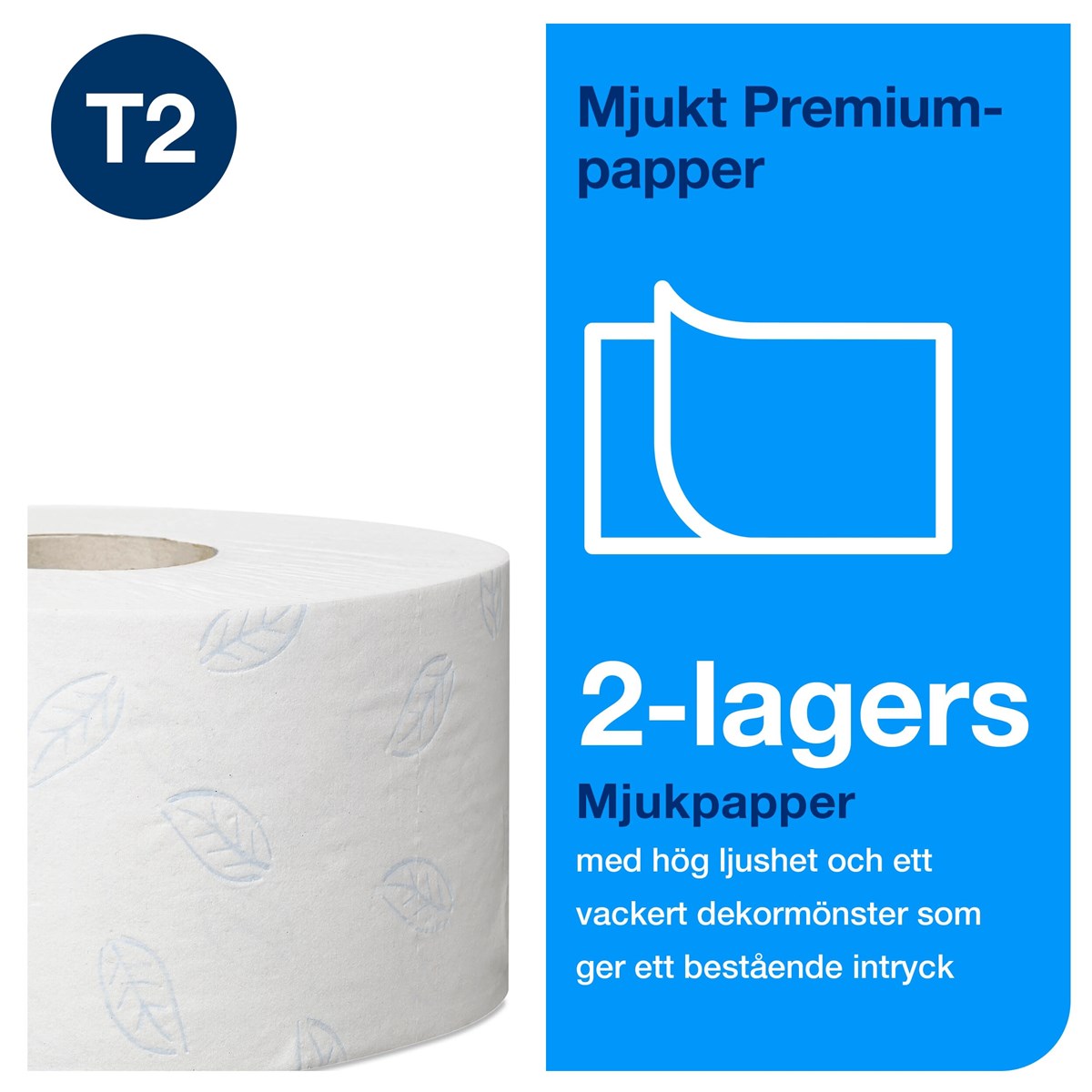 Mjukt toalettpapper av högsta kvalitet (Premium). Vitt, 2-lag, perforerat. Dekorprägling i blått. 170 m. 12 rl/förp. Passar till Tork hållare T2.